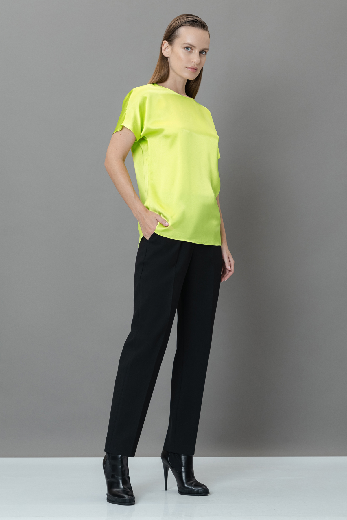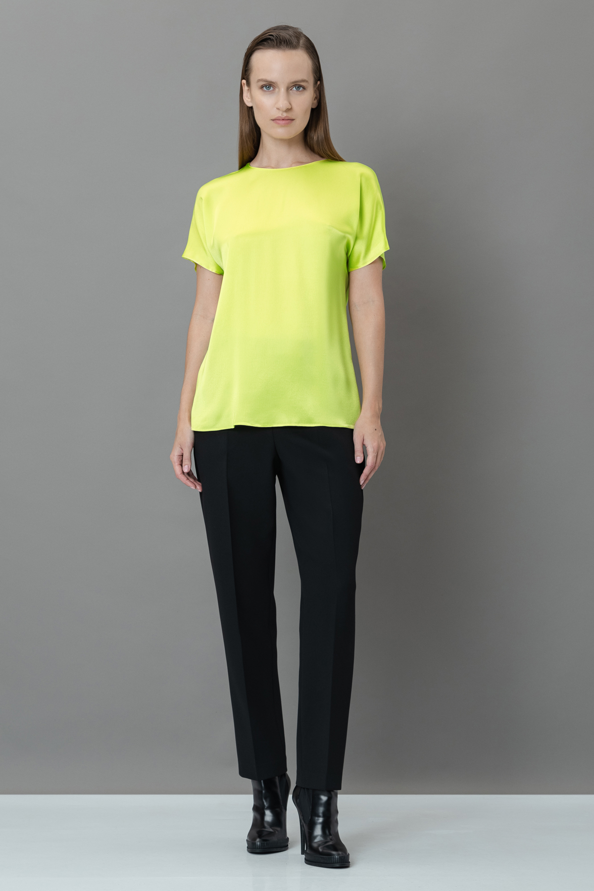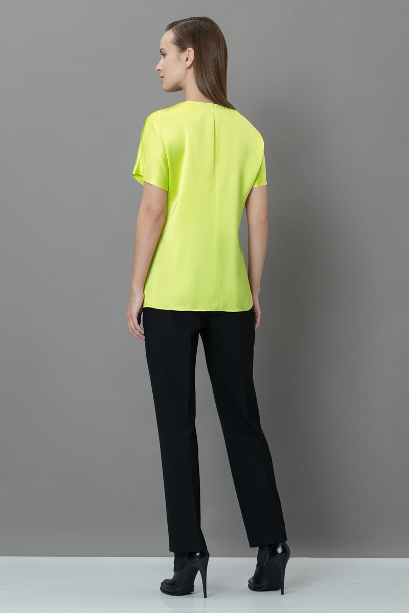 Блузка прямого кроя из 100% вискозы с легким блеском. Струящаяся ткань создает лаконичный силуэт. Модель дополнена круглым вырезом, укороченным рукавом реглан и застежкой на металлический крючок.