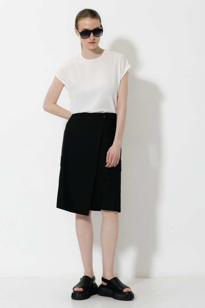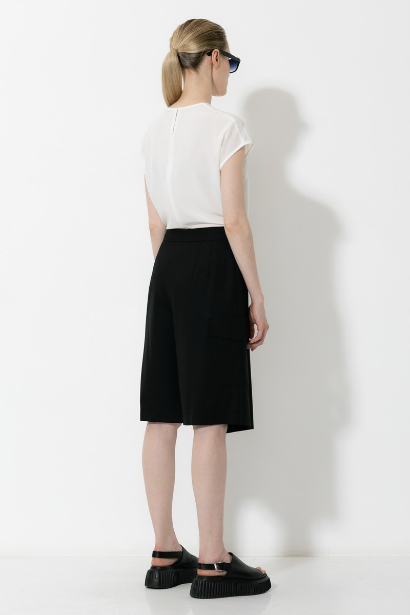 Шорты из легкой и очень приятной к телу смесовой ткани с добавлением вискозы. Передняя часть на запах с декоративным накладным карманом и пуговицей. Застежка на потайную молнию сзади. Изделие в сочетании с футболками и топами внесет разнообразие повседневный деловой гардероб.