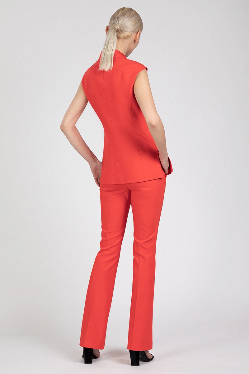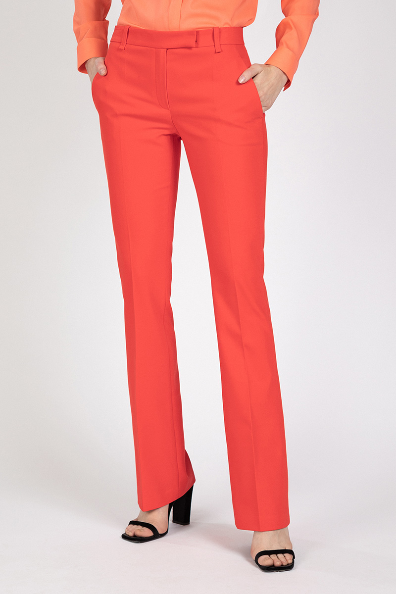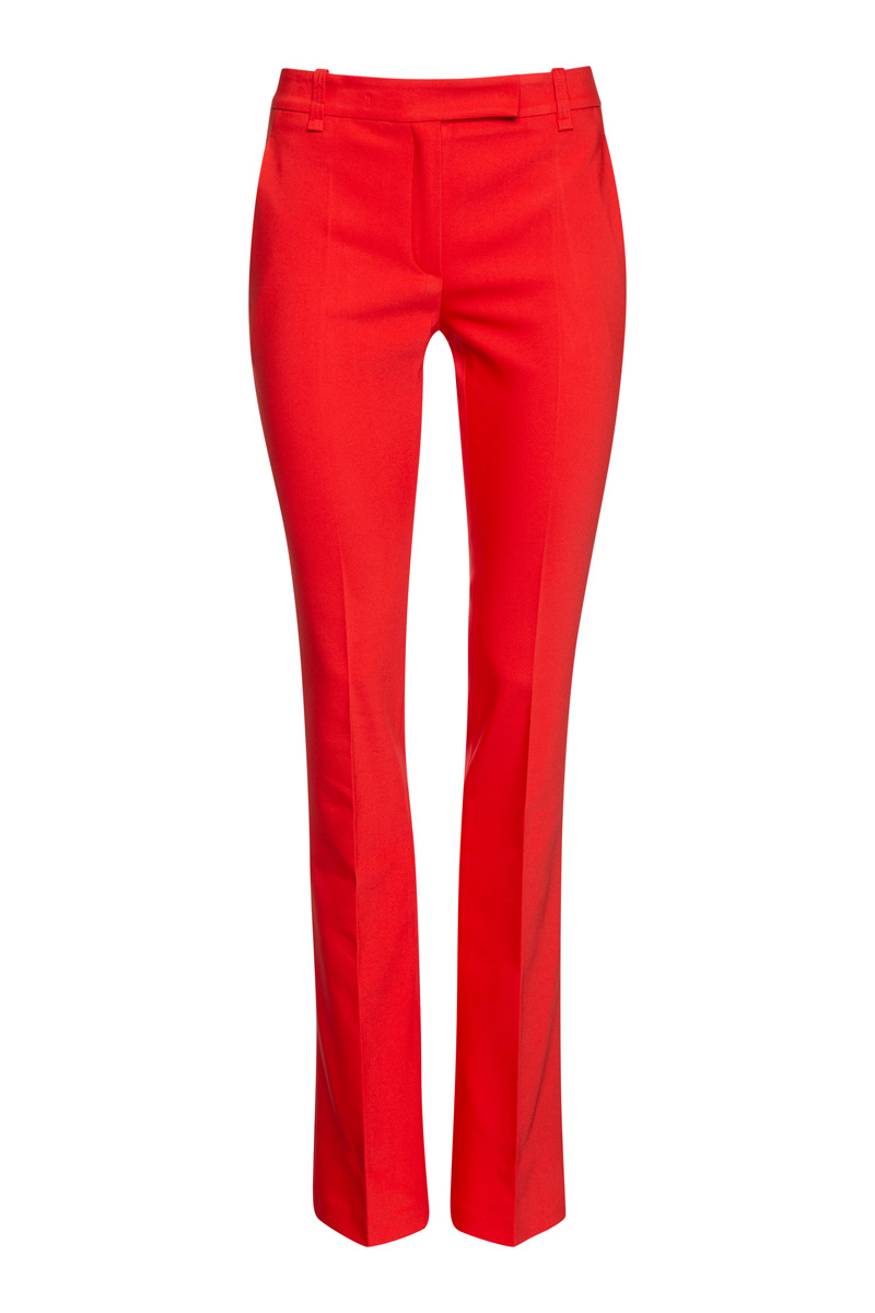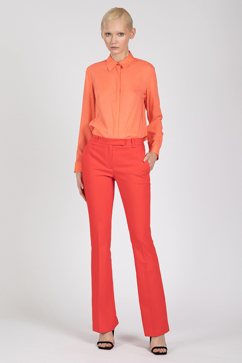 Брюки, расклешенные от колена, хорошо сочетаются с блузками, жилетами и удлиненными жакетами. Модель средней посадки выполнена в ультрамодном цвете этого сезона.