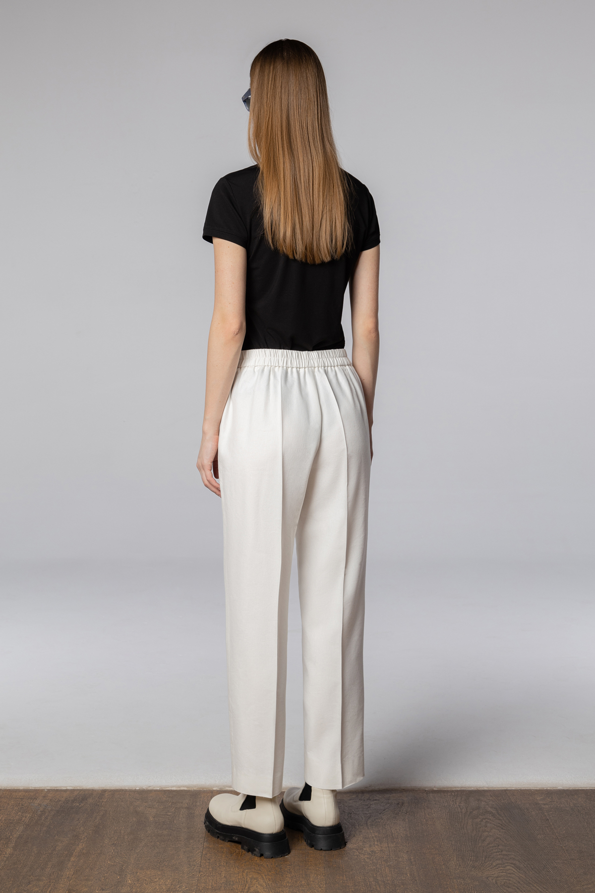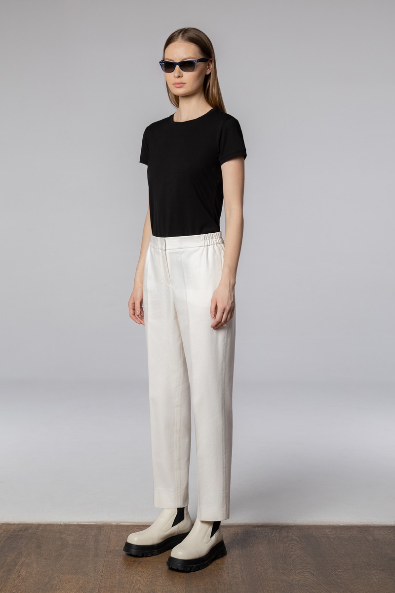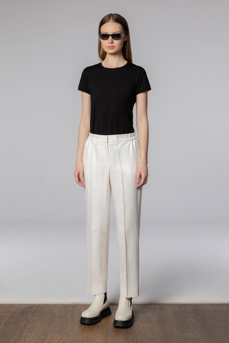 Лаконичные брюки со стрелками из микса хлопка и льна. Натуральная ткань отличается прочностью и обладает гладкой фактурой с мягким блеском. Модель прямого кроя выполнена в длине 7/8 и дополнена практичными карманами. Эластичная часть пояса обеспечивает комфортную посадку на талии. Брюки хорошо дополнят образы с футболками, рубашками и топами, а в комплекте с жакетом в тон сформируют элегантный деловой сет.