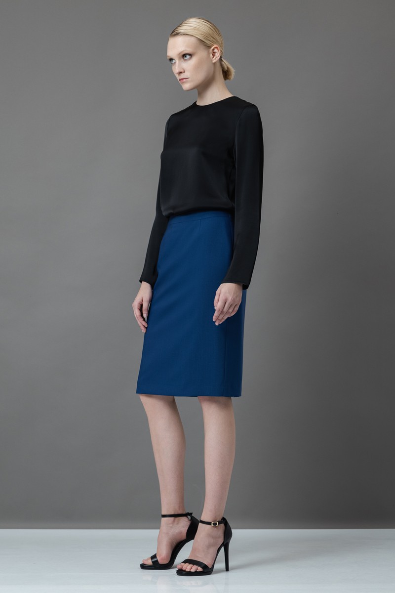 Лаконичная юбка в классической длине до колен. Модель прямого кроя дополнена шлицей на задней поверхности и застежкой на потайную молнию.