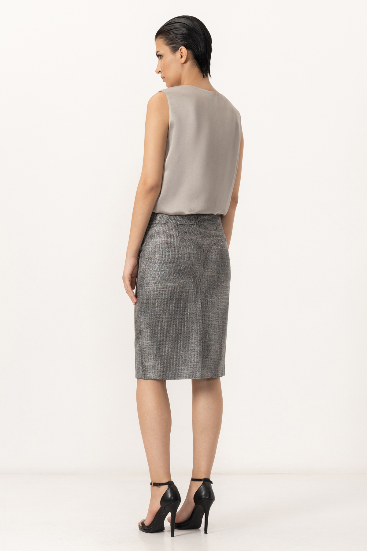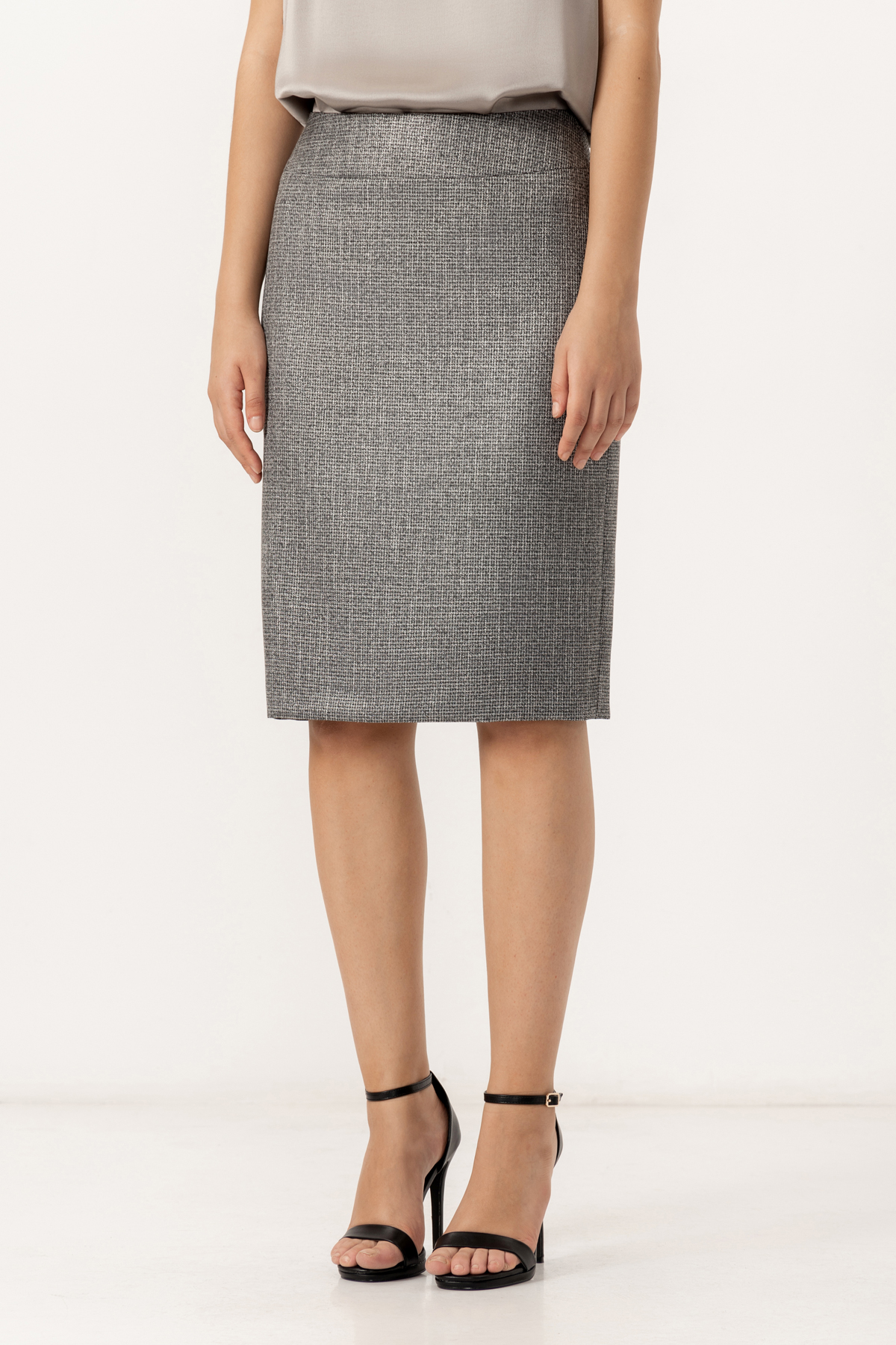 Юбка-карандаш из мияющей ткани с люрексом. Модель со средней посадкой дополнена широким поясом, шлицей и застежкой на потайную молнию.
