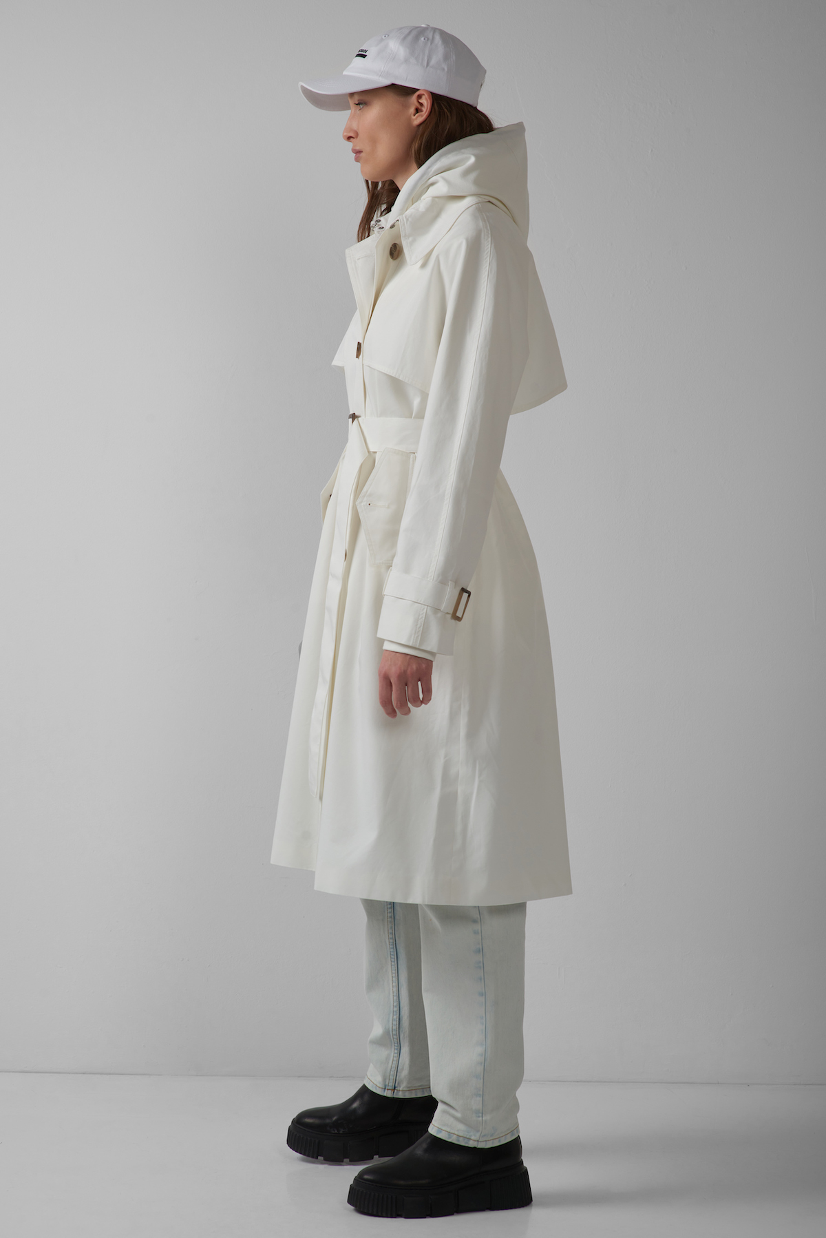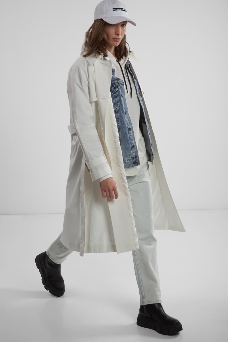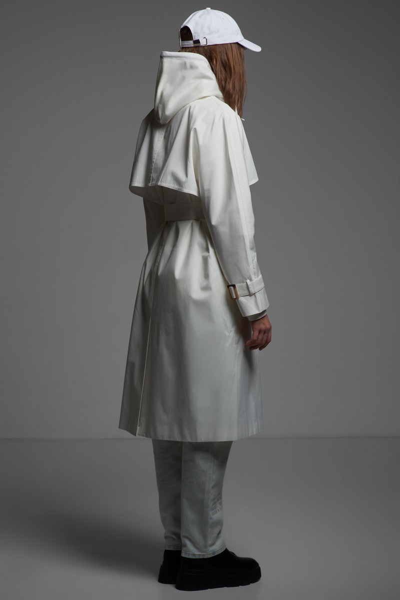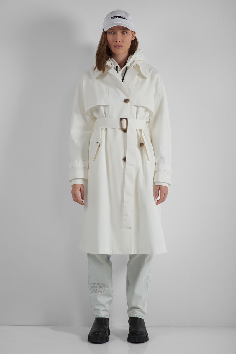 Тренч из 100% хлопка в белом цвете. Актуальная модель с цельнокроеным рукавом, кокеткой, застежкой на пуговицы и поясом с пряжкой. Универсальный вариант для любых случаев.
