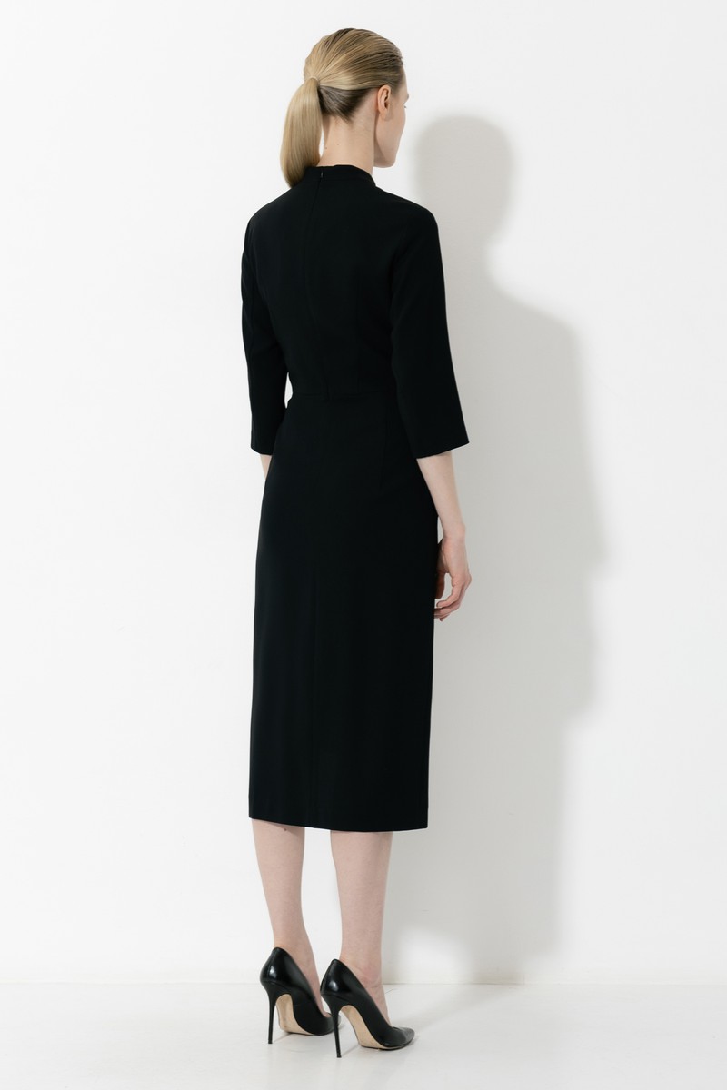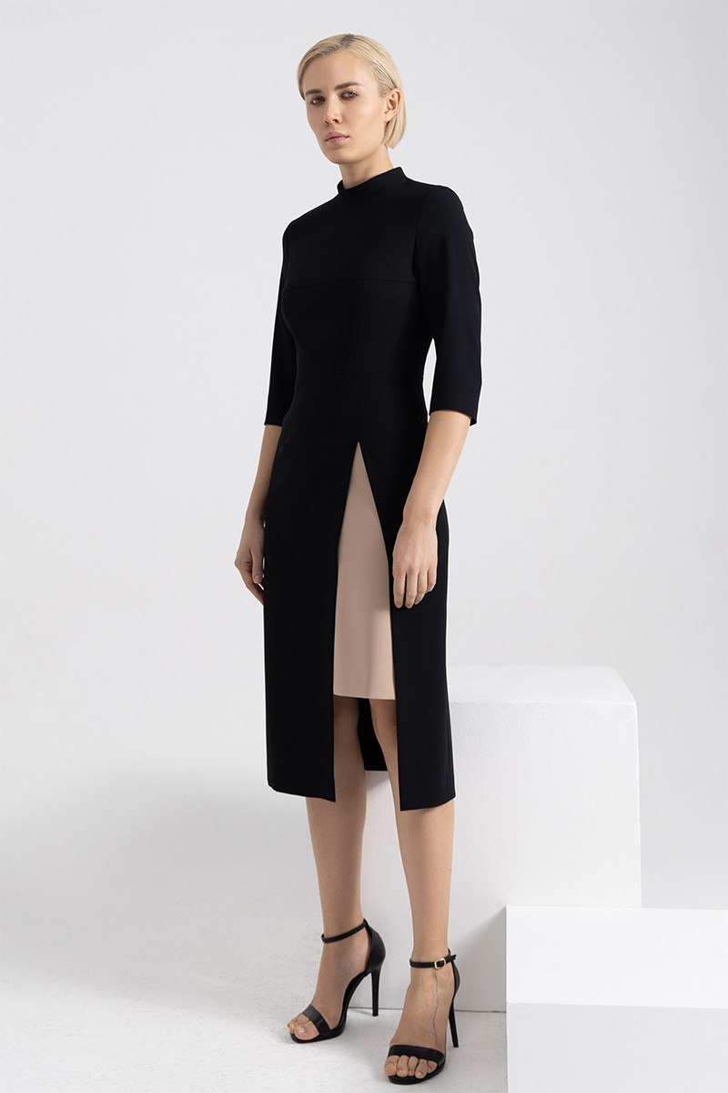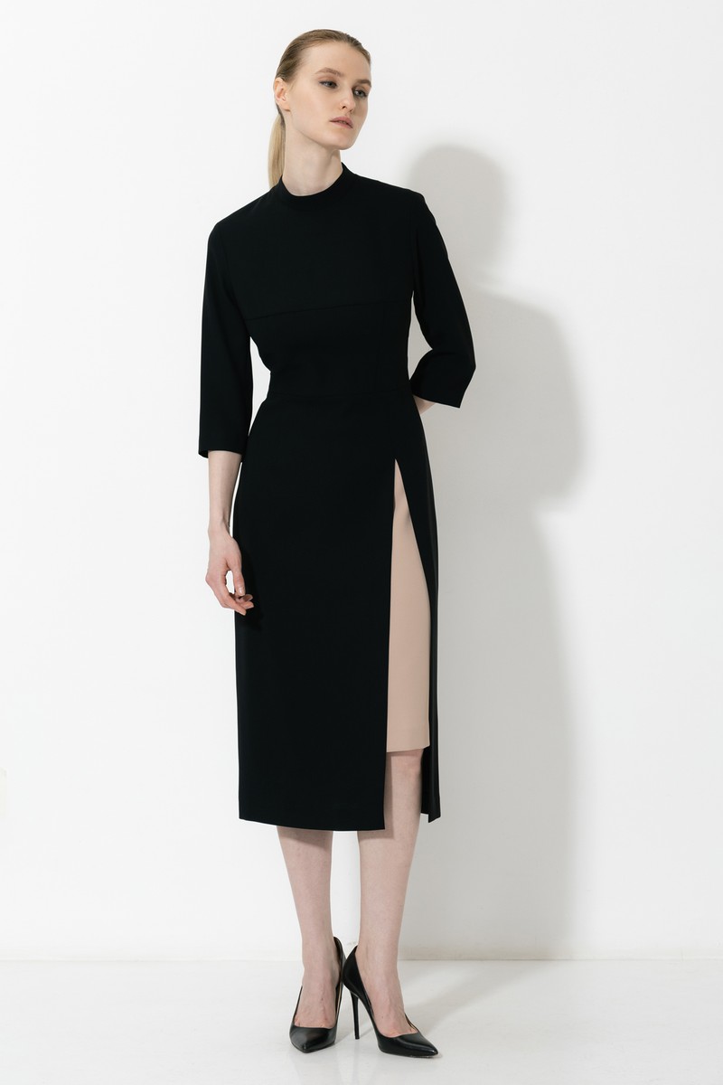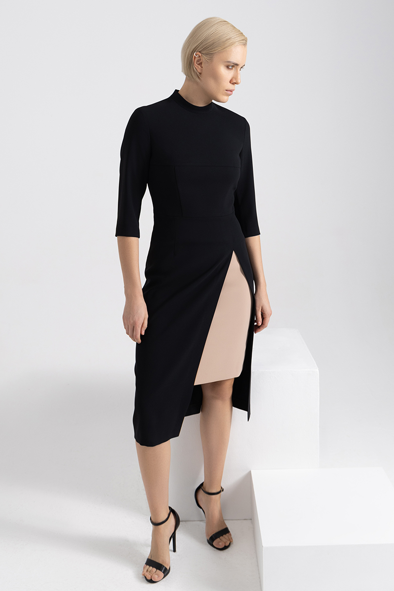 Черное лаконичное приталенное платье с рукавом 3/4. Изделие дополняет высокий разрез на левой ноге, бежевая вставка создает вид голого тела. Боковые вытачки и потайная молния обеспечивают идеальную посадку по фигуре.