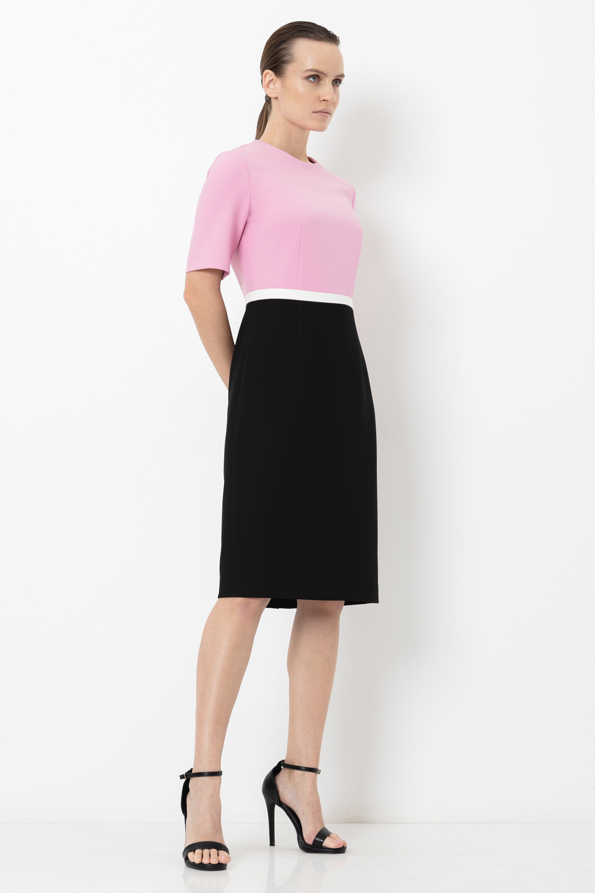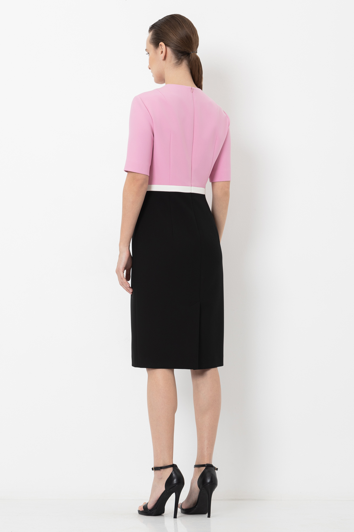 Приталенное платье с длиной рукавов 2/4. Модель, выполненная в стиле колор-блок, сочетает в себе 3 цвета — розовый, черный и белый. Белый цвет, элегантно опоясывающий линию талии, создает иллюзию сочетания двух изделий — блузки и юбки-карандаша.