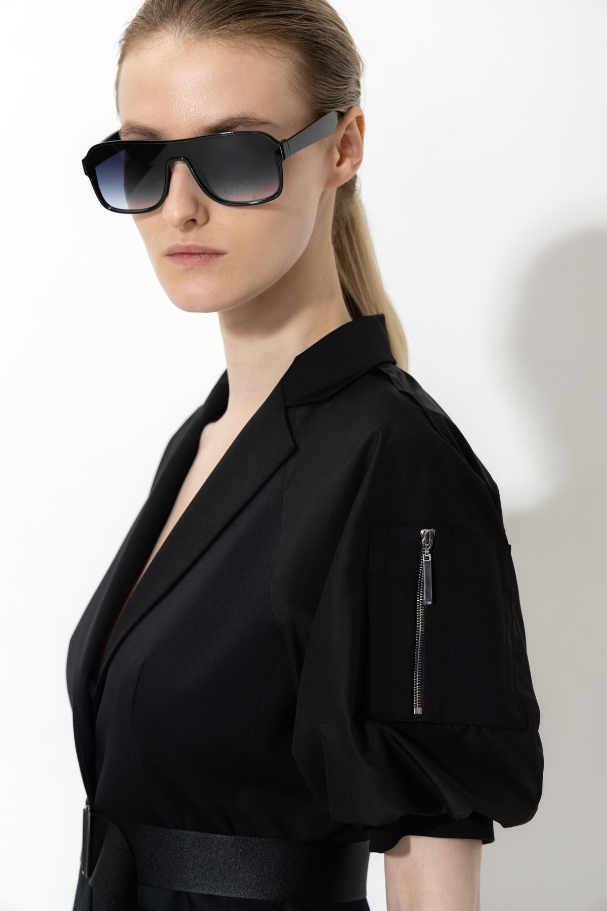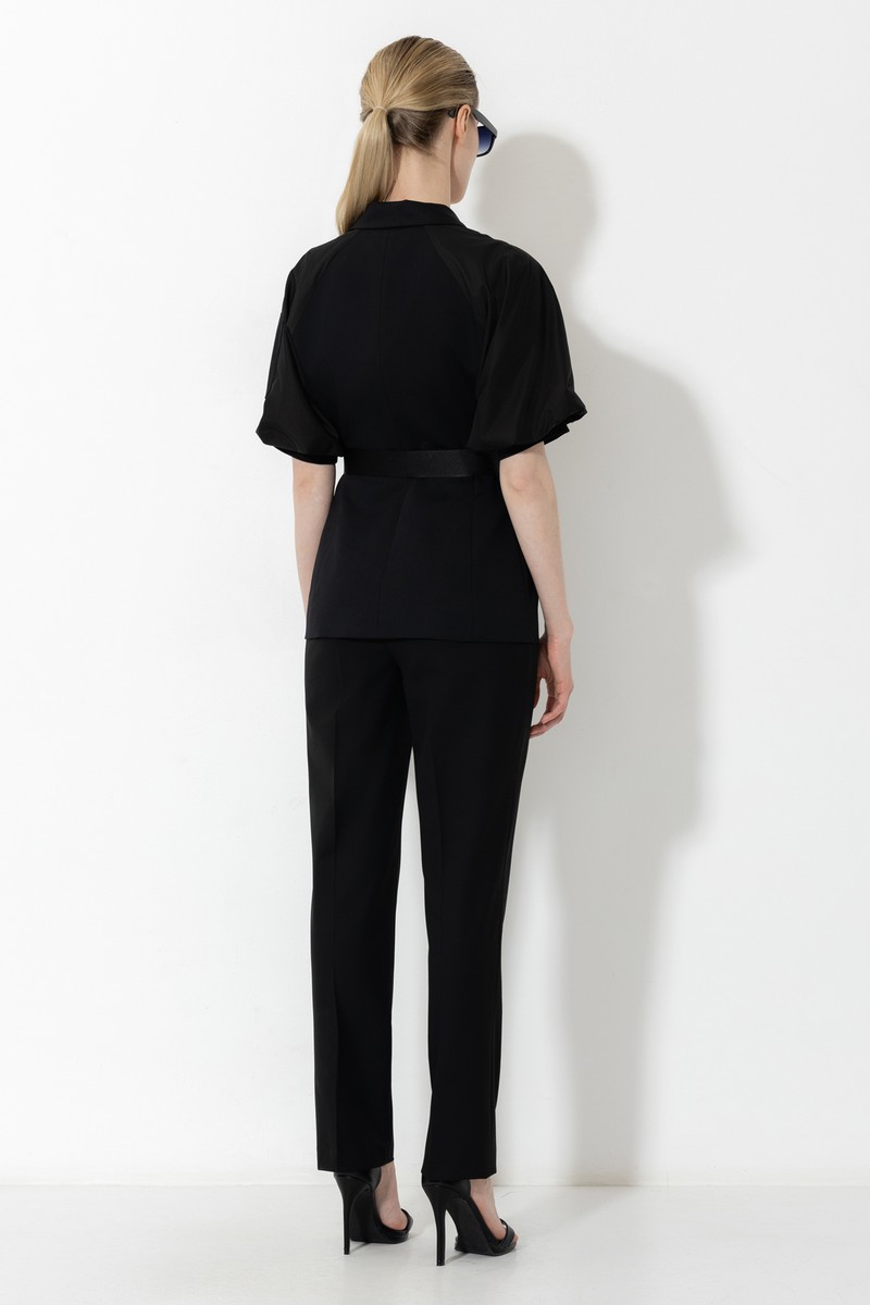 Приталенный жакет из смесового материала с поясом-стропой и отложным воротником. Рукава-буфы дополены декоративной молнией.