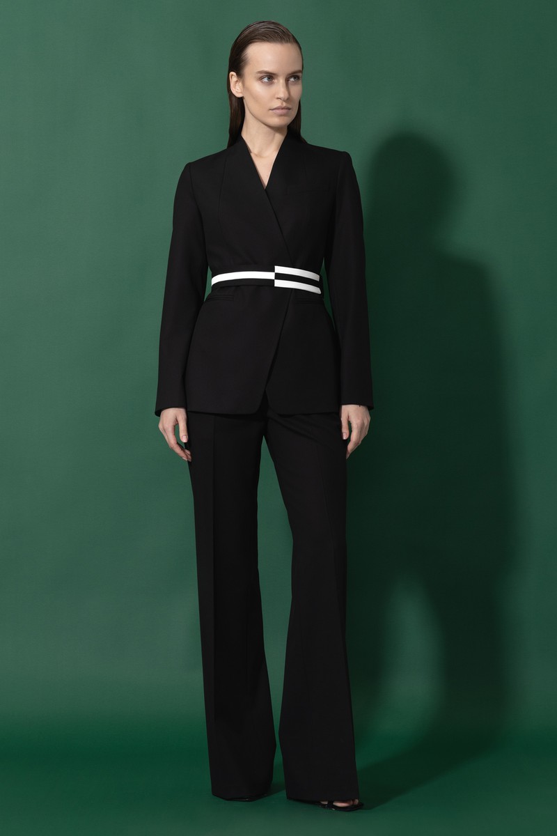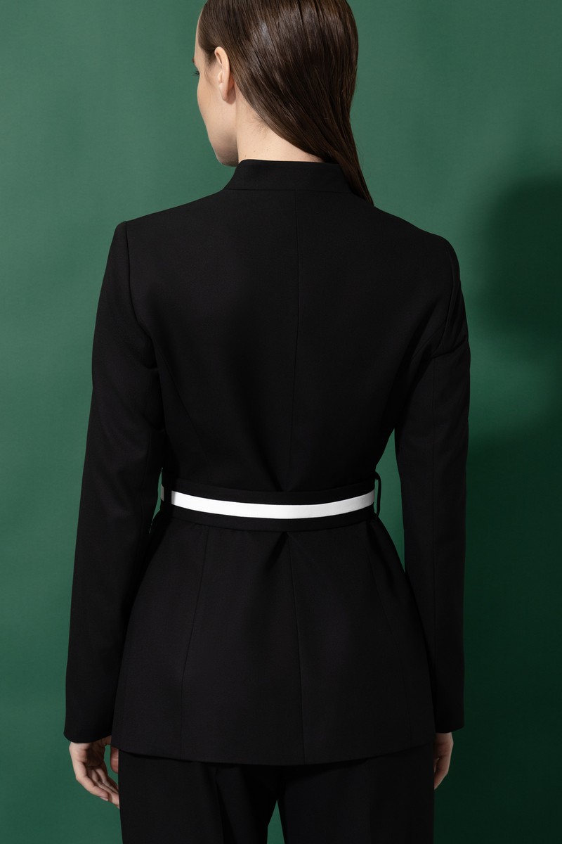 Черный жакет приталенного кроя из смесовой костюмной ткани с добавлением вискозы. Мягкий пояс-стропа с графичными контрастными линиями подчеркивает линию талии. Изделие отлично впишется в многослойные образы или станет акцентной деталью костюмного сета.