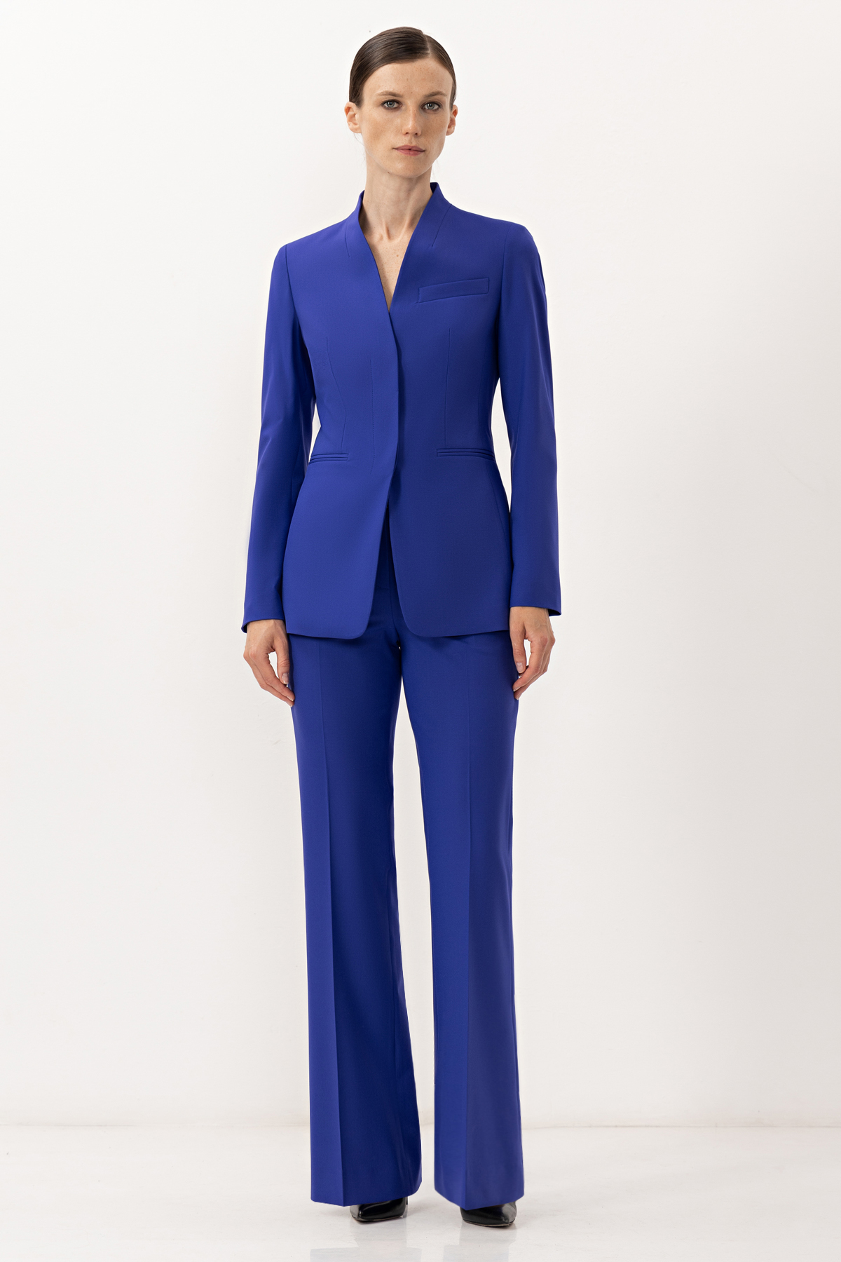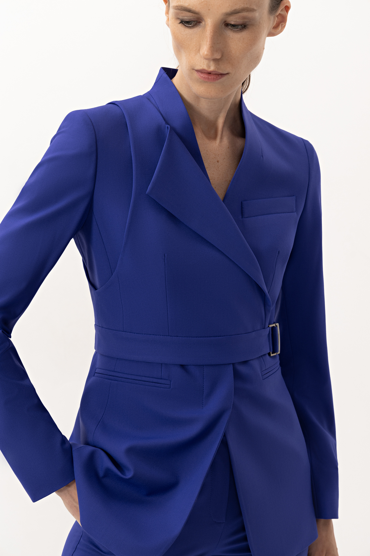 Приталенный жакет с воротником-стойкой и супатной застежкой. Ткань на основе поликерамических нитей обеспечивает долговечность изделия и комфорт при носке. Жакет гармонично дополнен съемным укороченным жилетом на одно плечо.