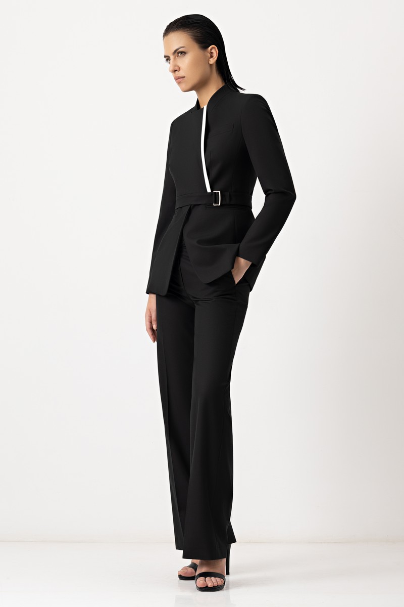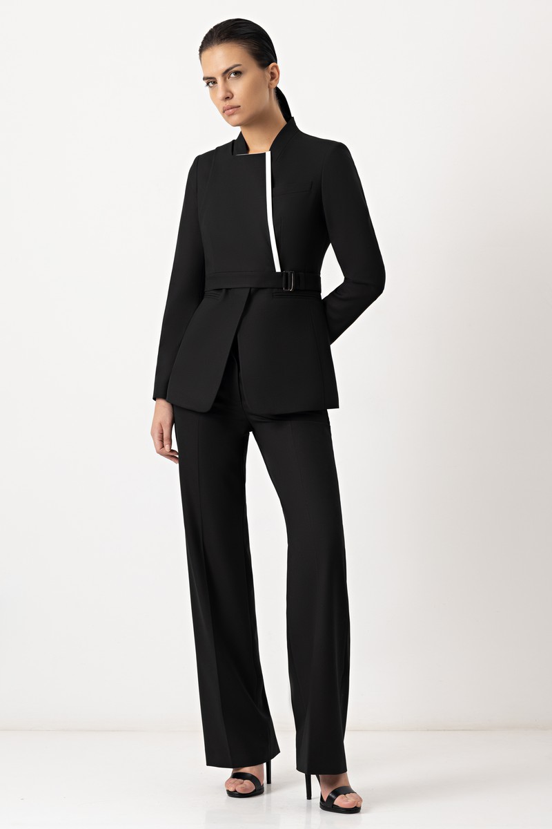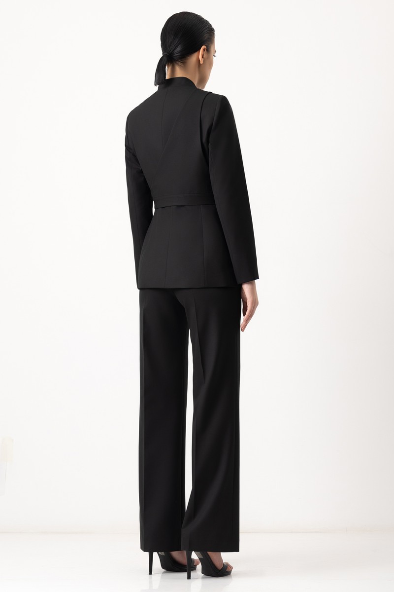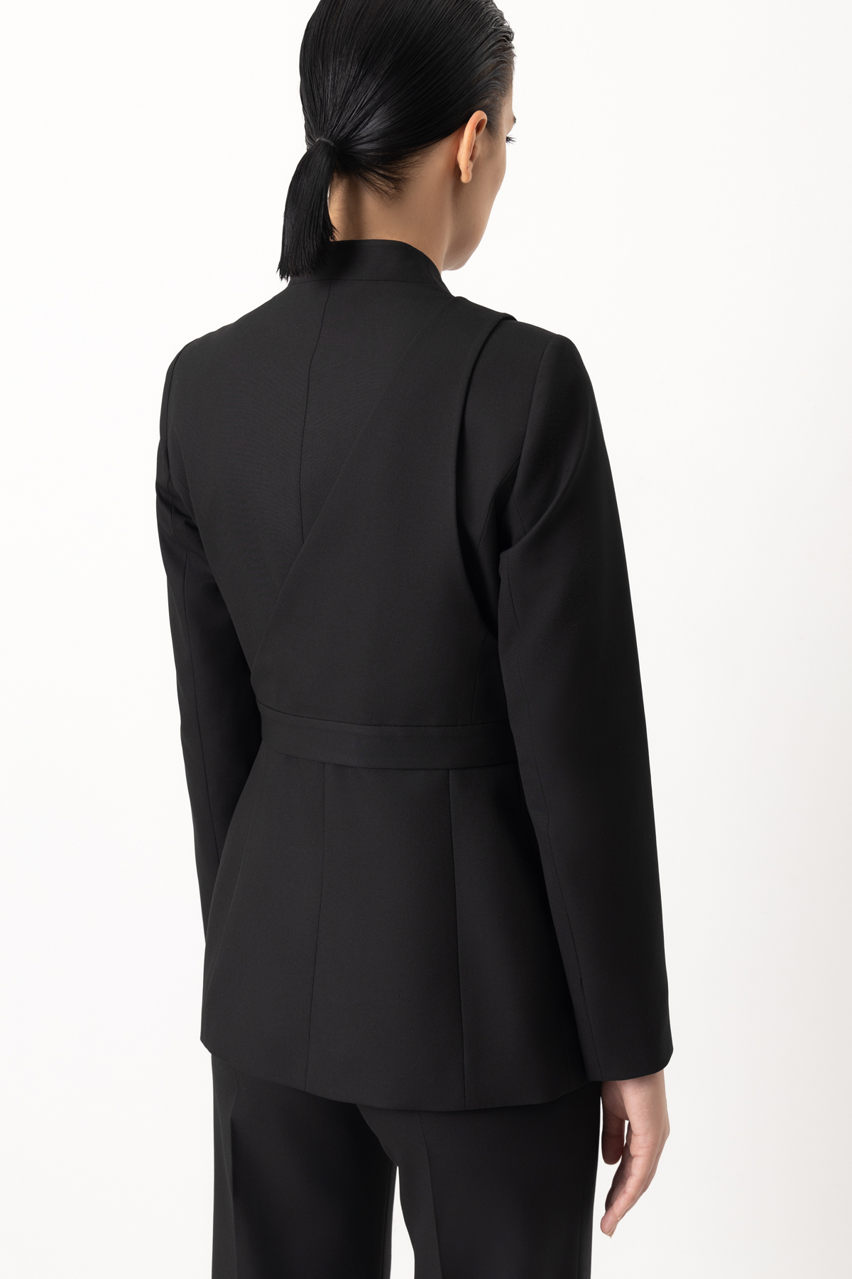 Приталенный жакет с воротником-стойкой и супатной застежкой. Ткань на основе поликерамических нитей обеспечивает долговечность изделия и комфорт при носке. Жакет гармонично дополнен съемным укороченным жилетом на одно плечо.