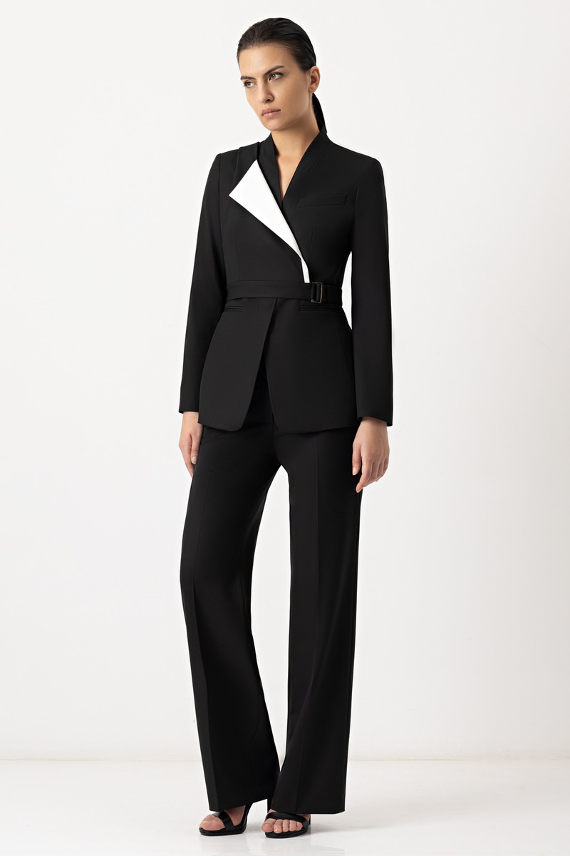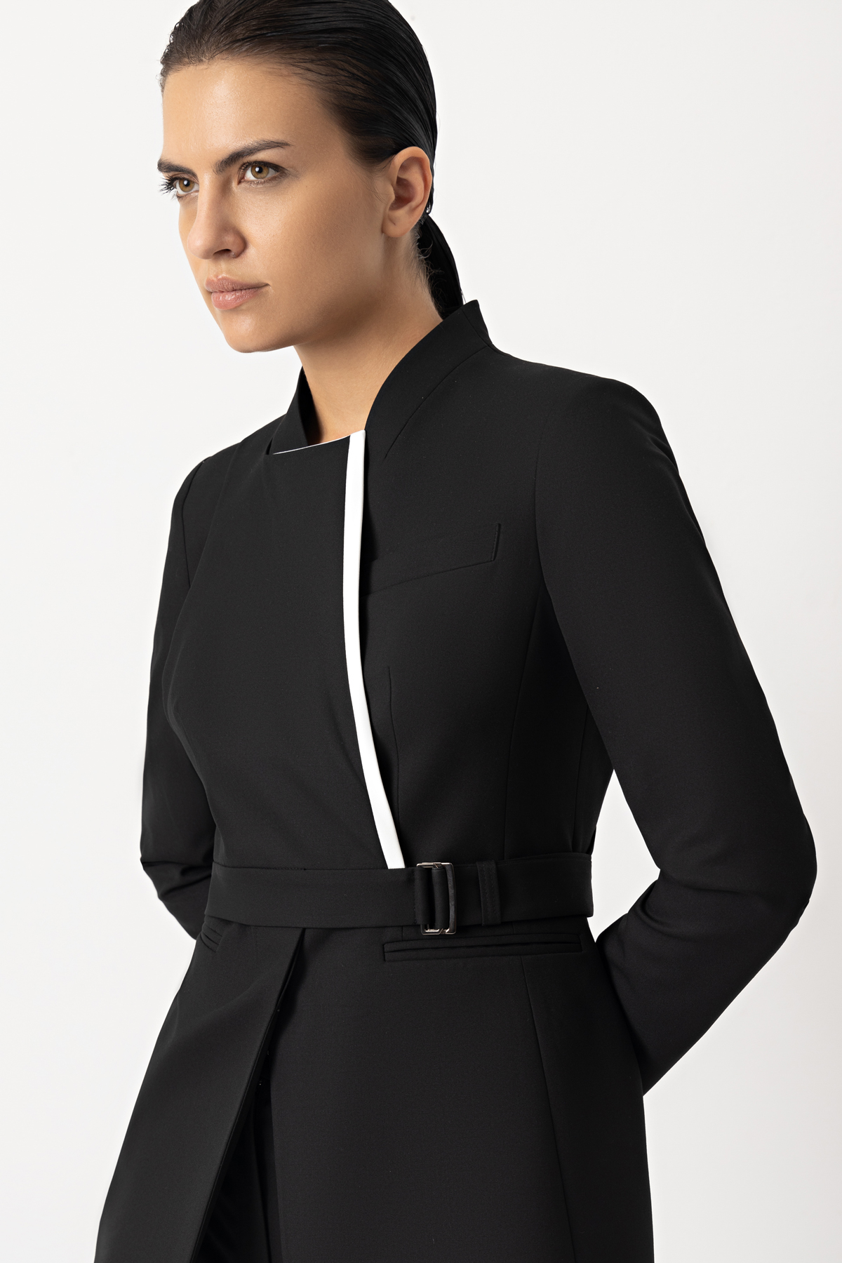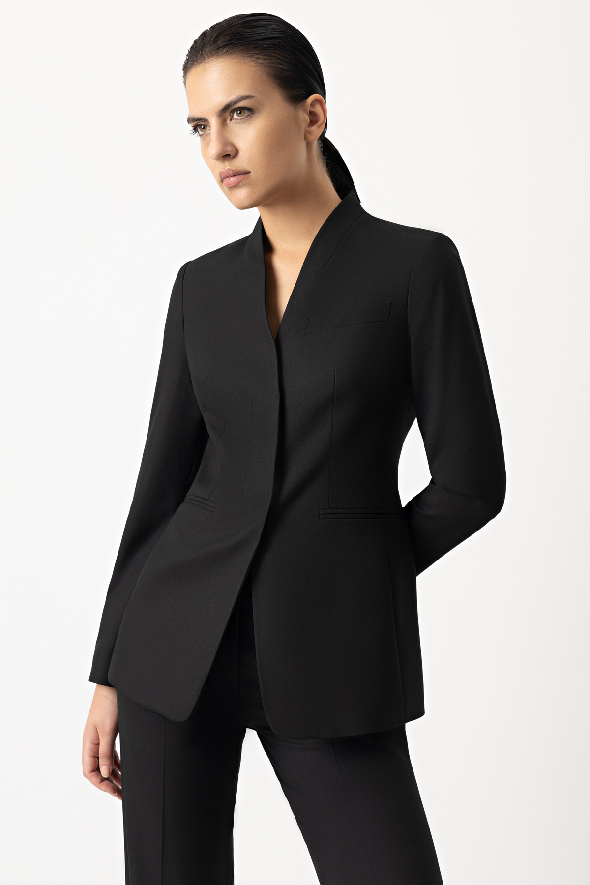 Приталенный жакет с воротником-стойкой и супатной застежкой. Ткань на основе поликерамических нитей обеспечивает долговечность изделия и комфорт при носке. Жакет гармонично дополнен съемным укороченным жилетом на одно плечо.