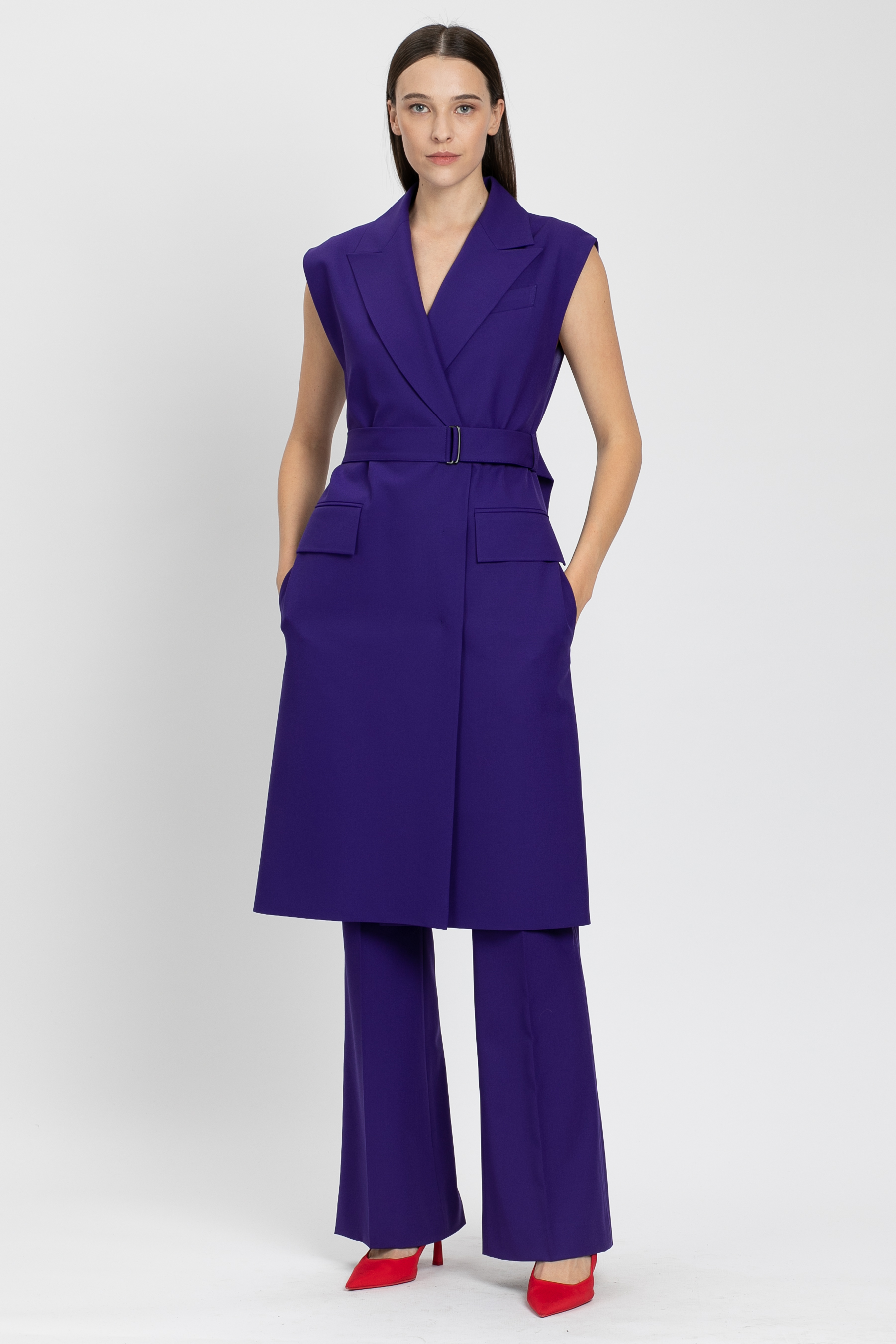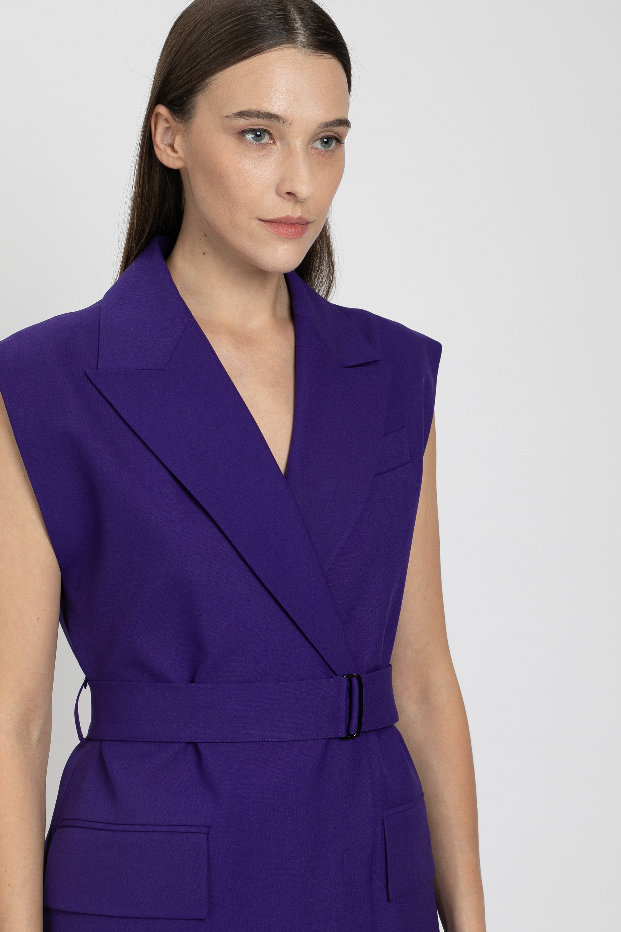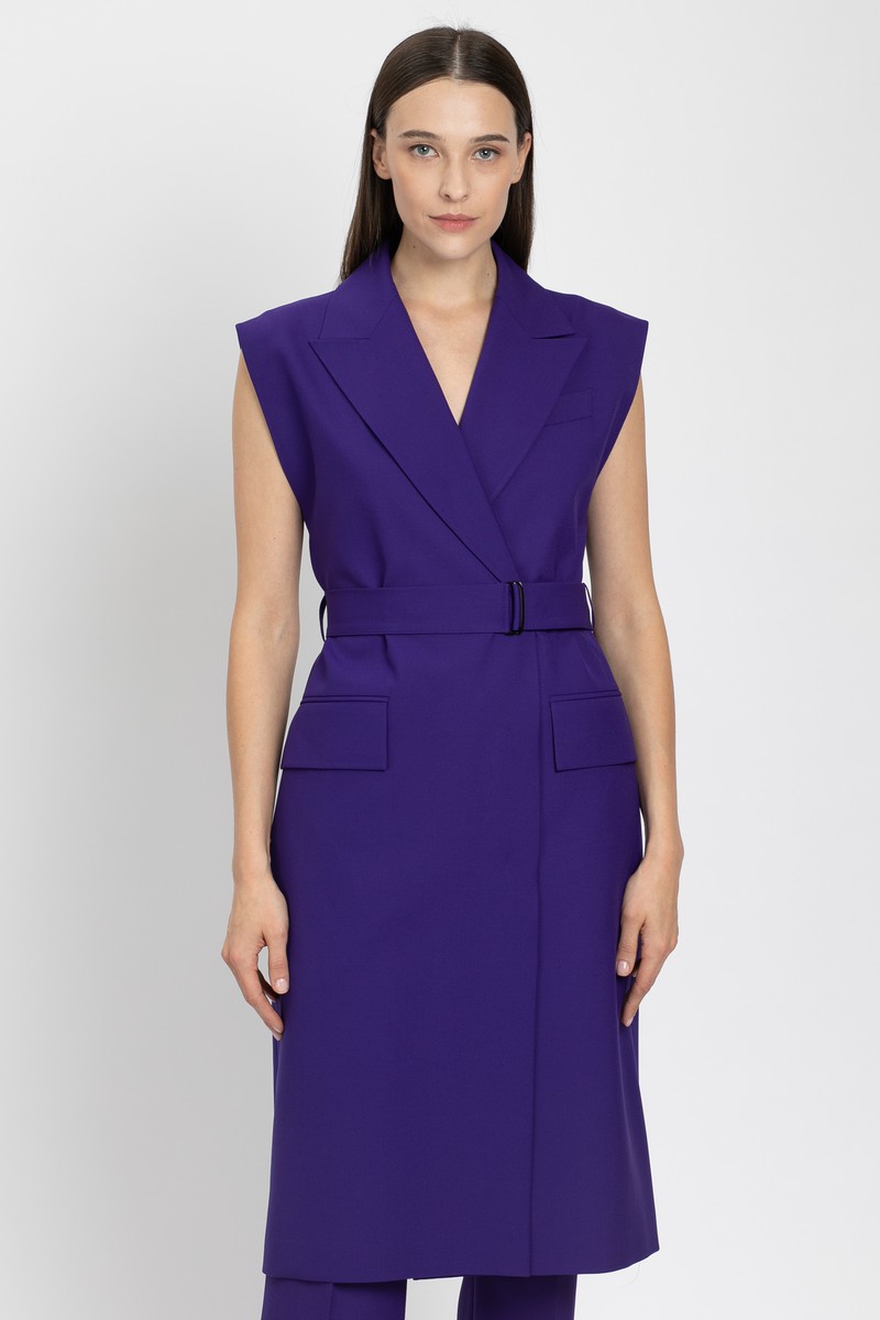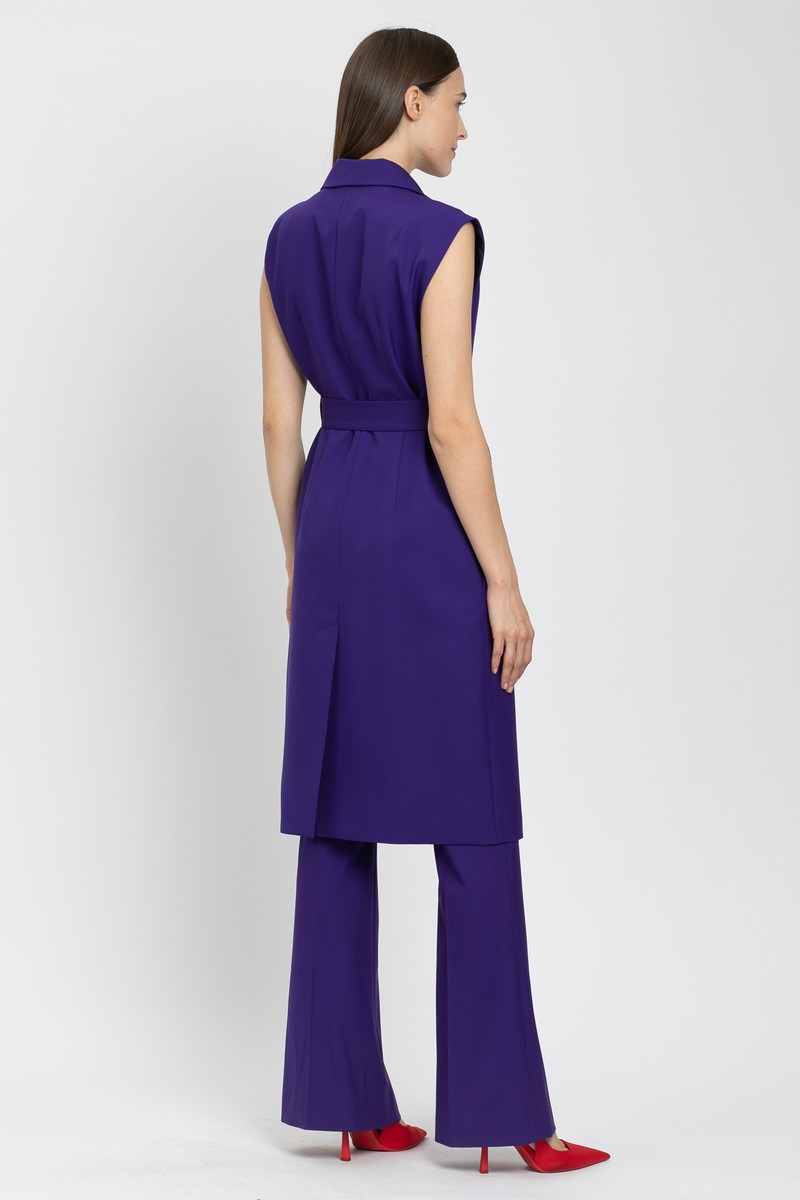 Удлиненный жилет в фиолетовом оттенке. Модель дополнена расширенными плечами, лацканами и поясом. Карманы в боковых швах.