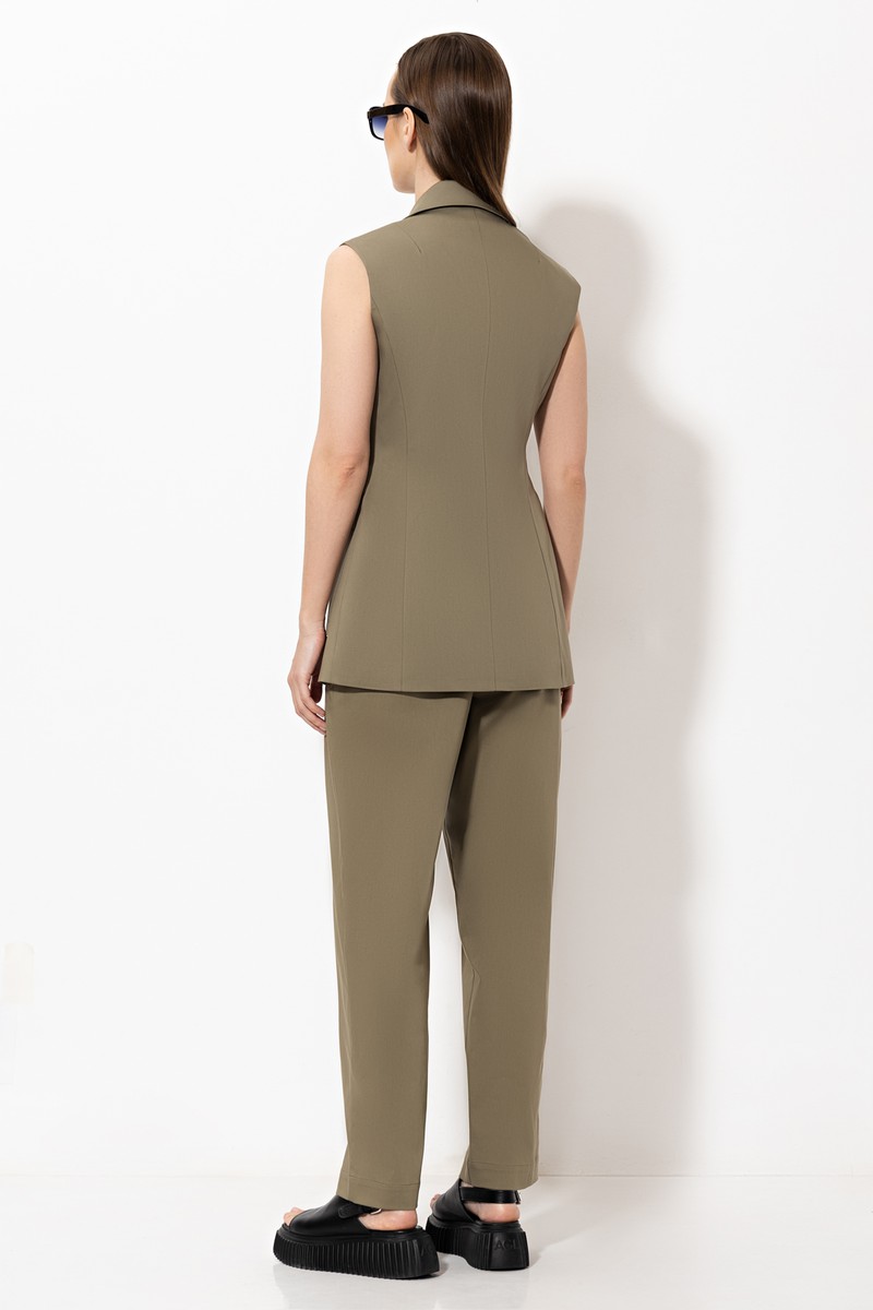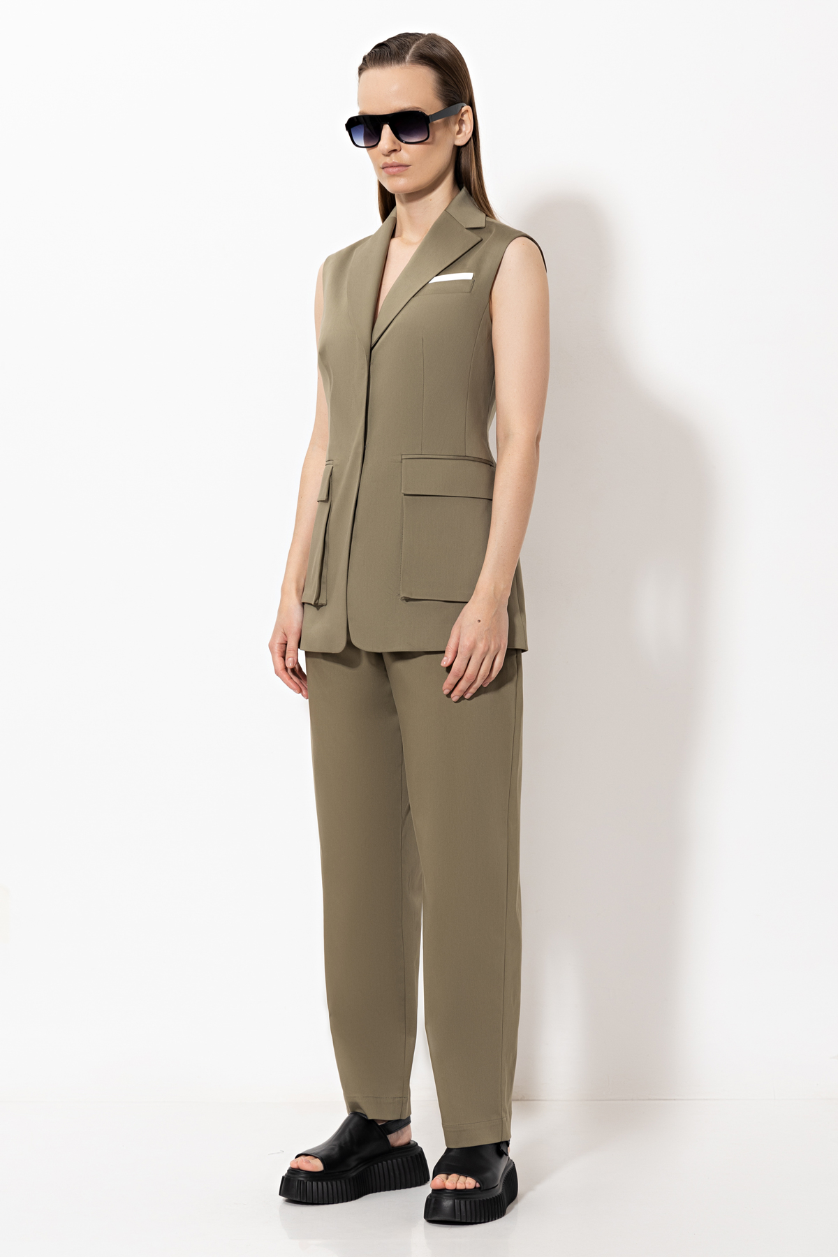 Приталенный удлиненный жилет без рукавов с английским воротником и накладными карманами. Деталью служит нагрудный карман.