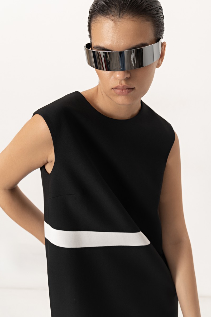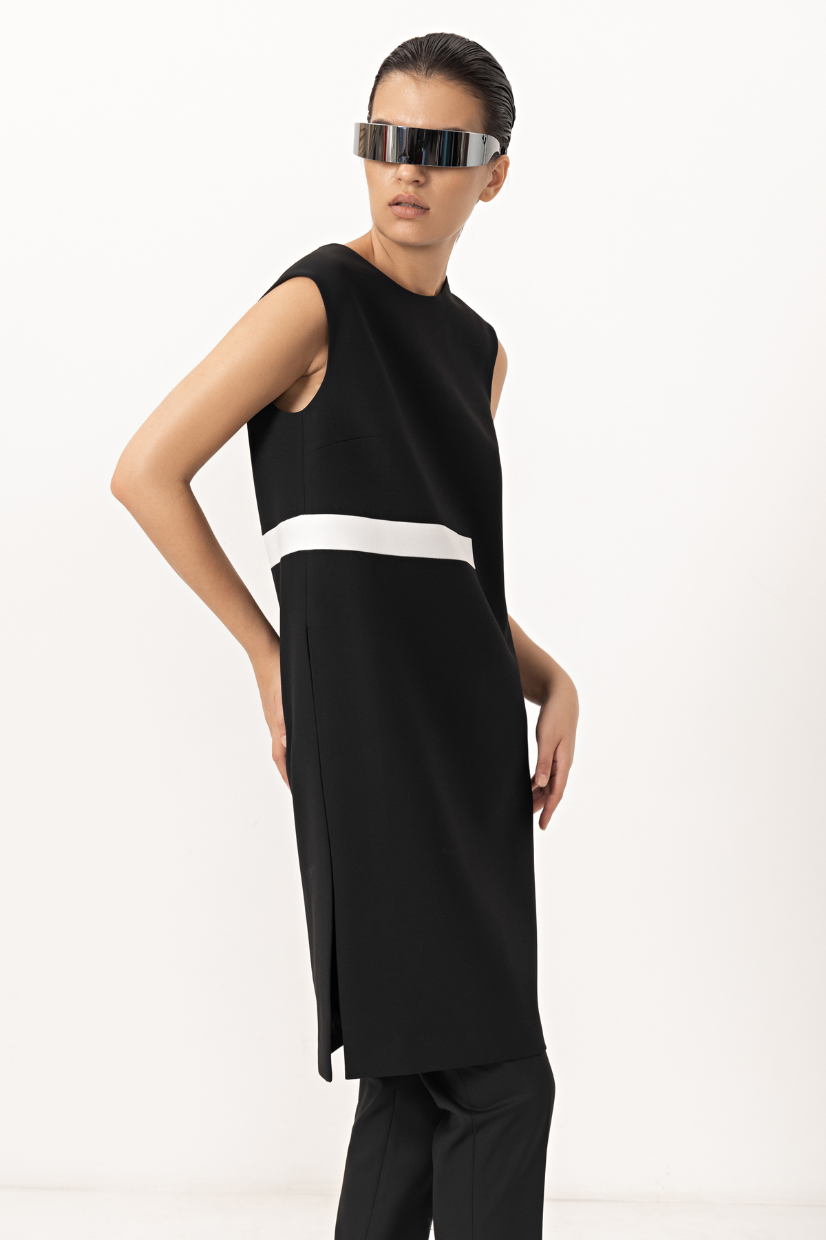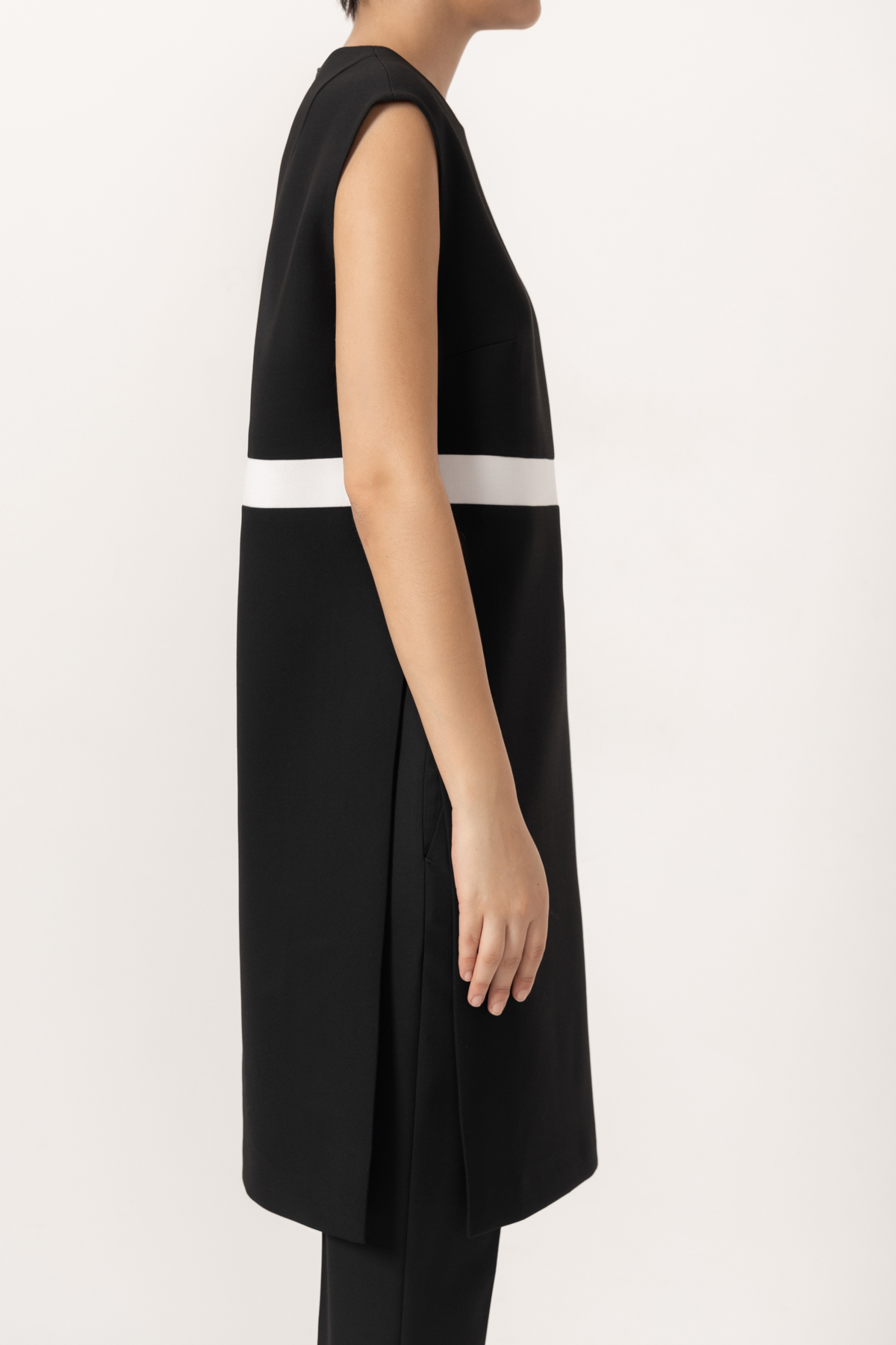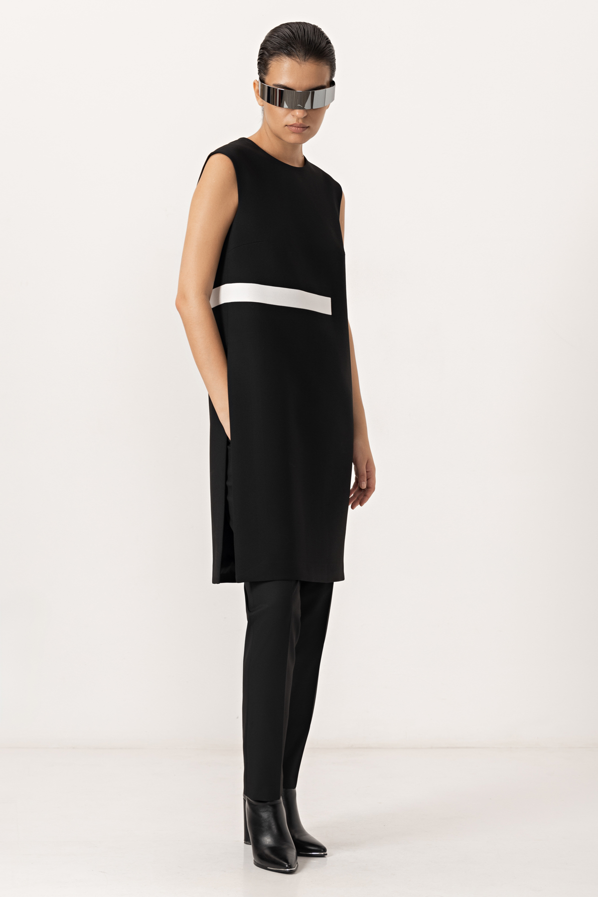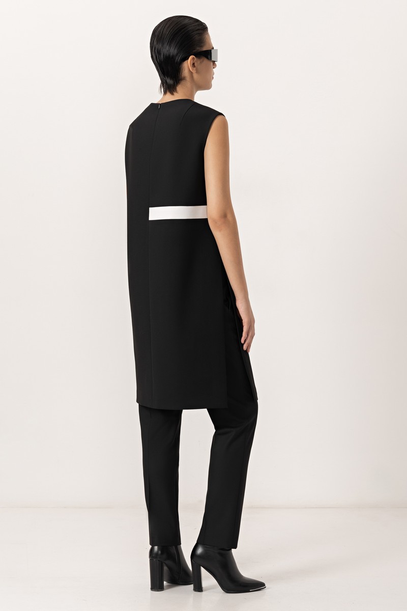 Удлиненный жилет-туника прямого кроя с высоким разрезом сбоку из плотной костюмной ткани с добавлением хлопка. Асимметричная композиция контрастной детали акцентирует внимание в области талии.