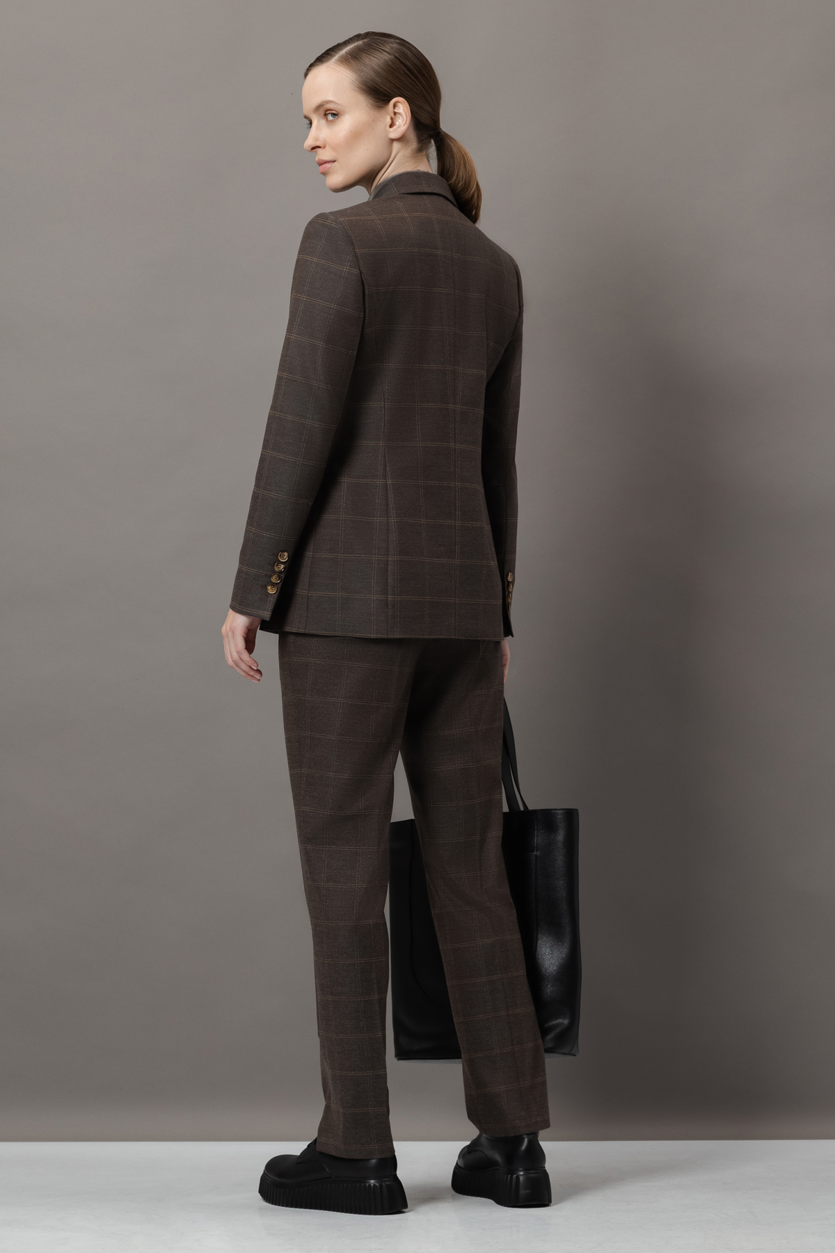 - однобортный жакет приталенного кроя с графичными лацканами, пуговицами и прорезными карманами;