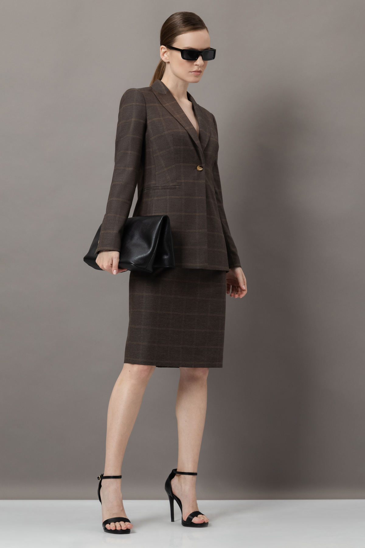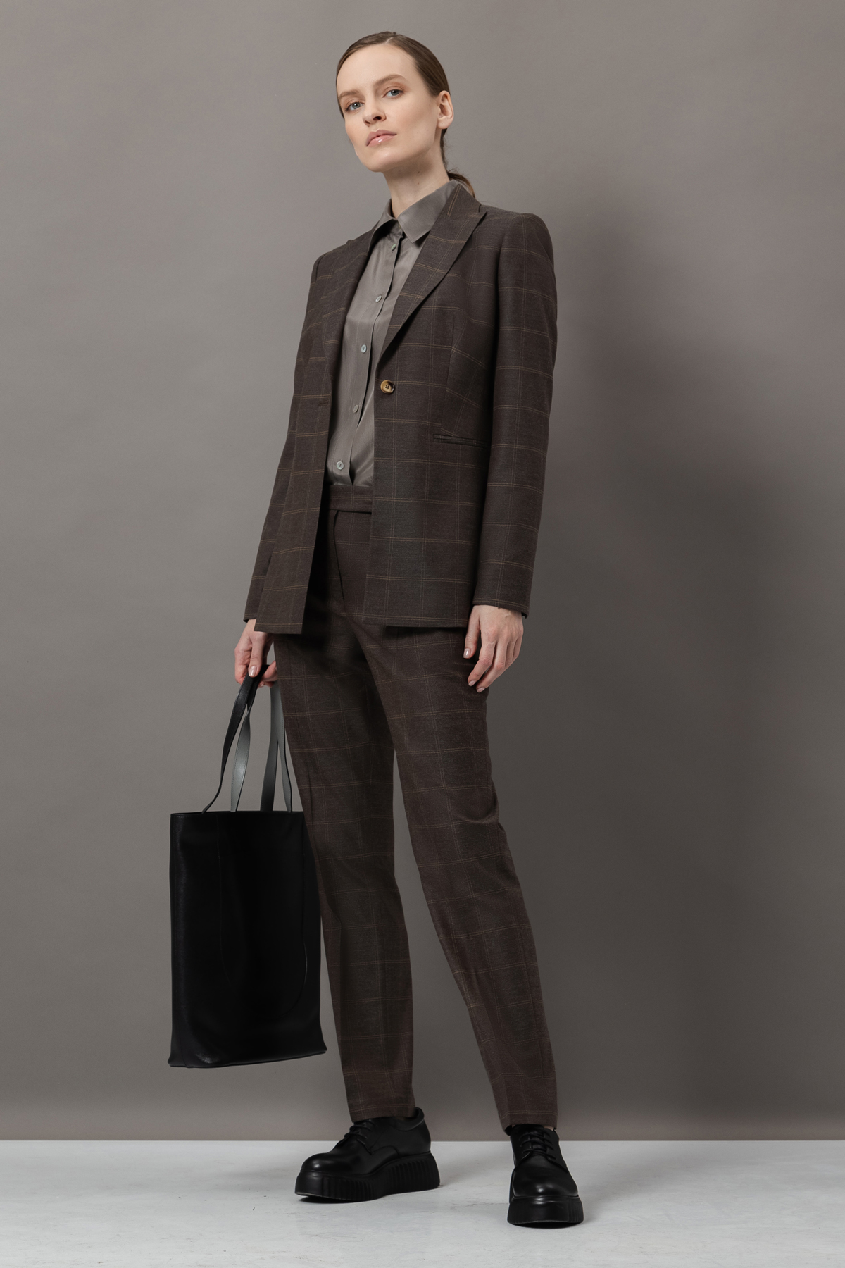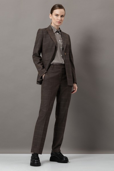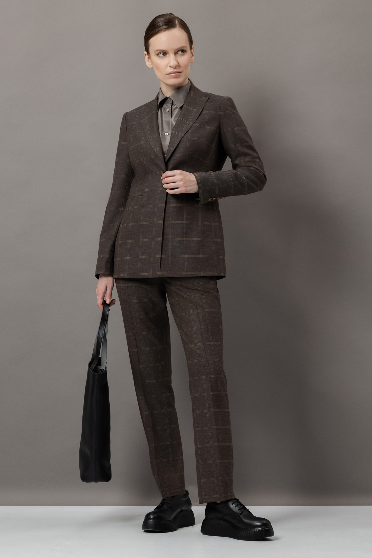 - однобортный жакет приталенного кроя с графичными лацканами, пуговицами и прорезными карманами;