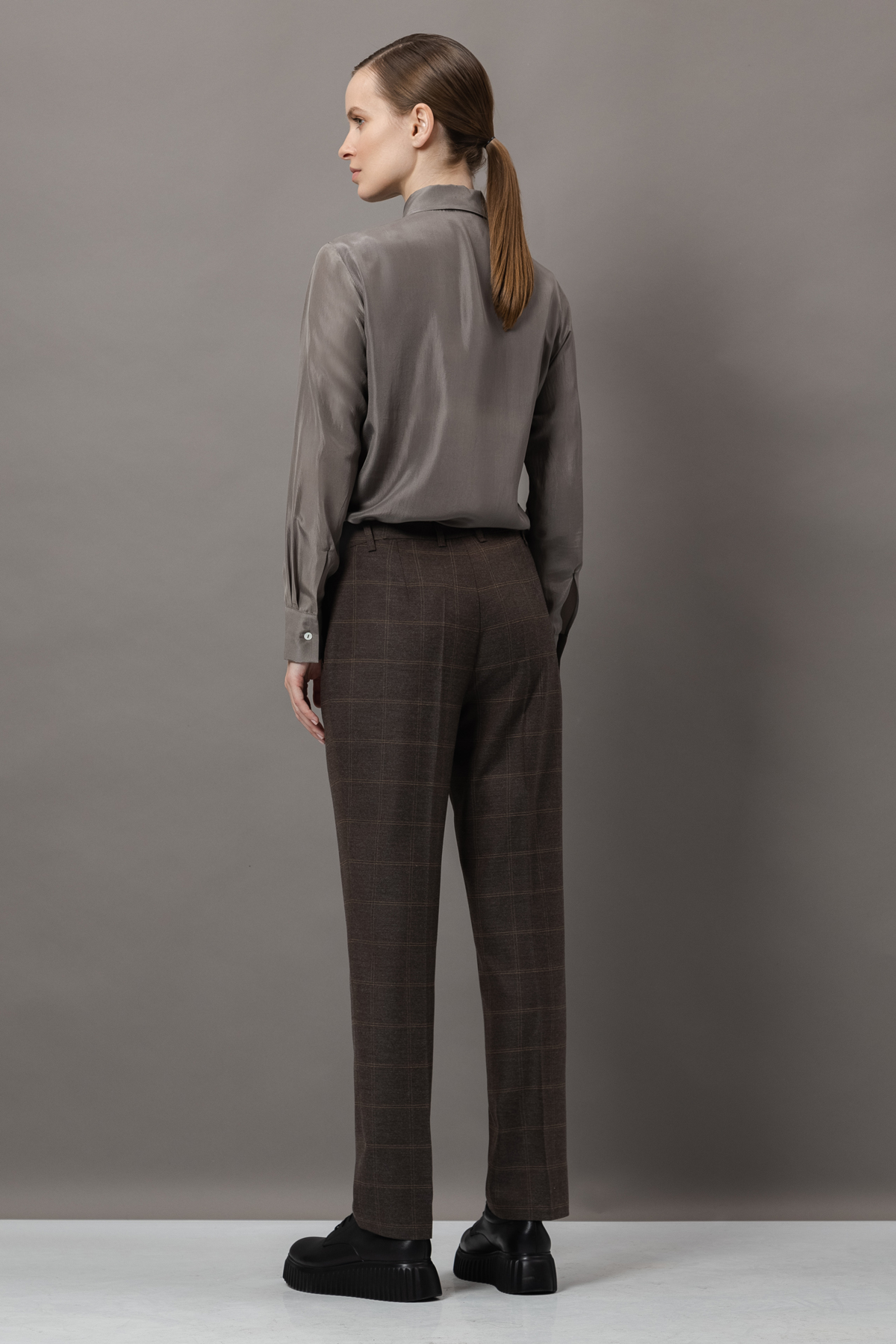 - зауженные брюки со стрелками, боковыми карманами, мягким поясом со шлевками и застежкой на потайную молнию и металлический крючок;