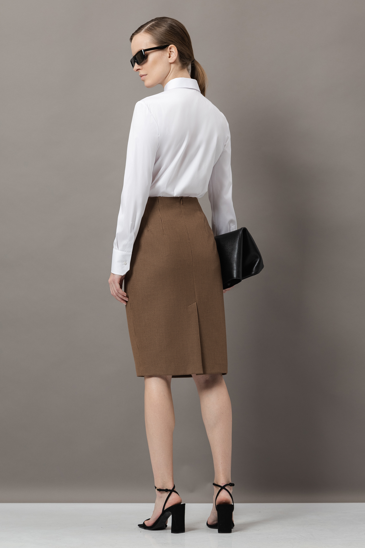 - прямую юбку в классической длине до колен со шлицей и застежка на потайную молнию на задней поверхности.