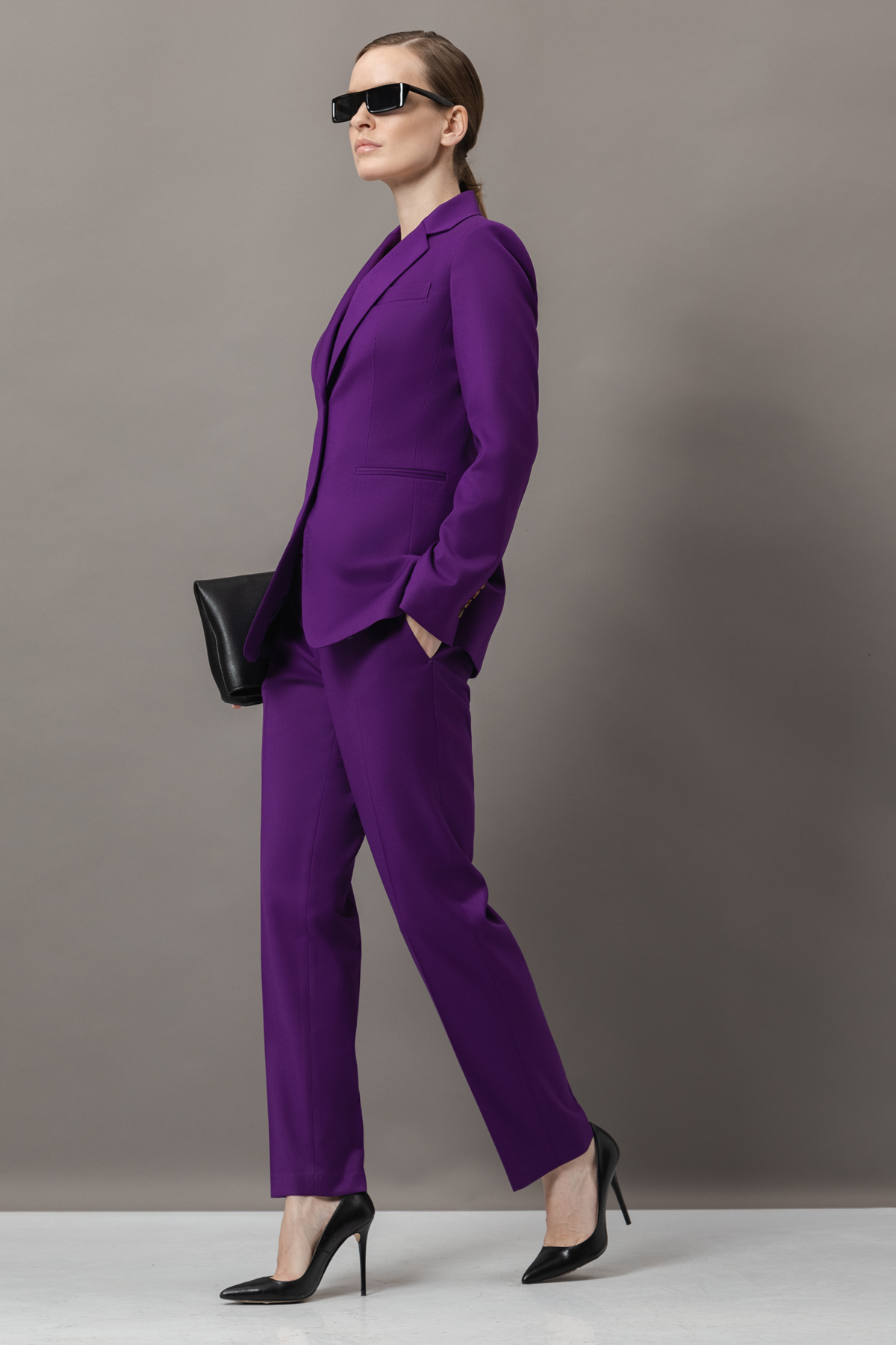 - однобортный жакет приталенного кроя с графичными лацканами, пуговицами в тон и прорезными карманами;