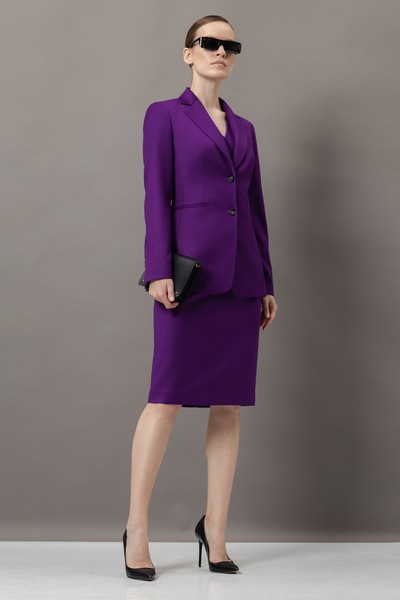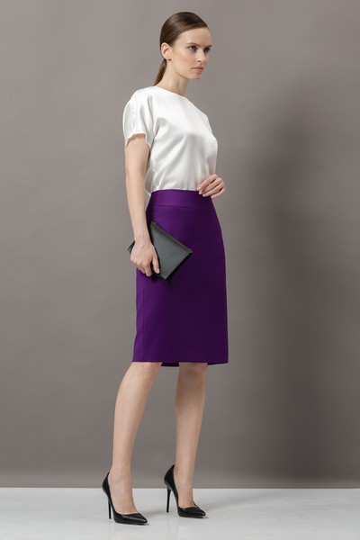 - прямую юбку в классической длине до колен со шлицей и застежка на потайную молнию на задней поверхности.