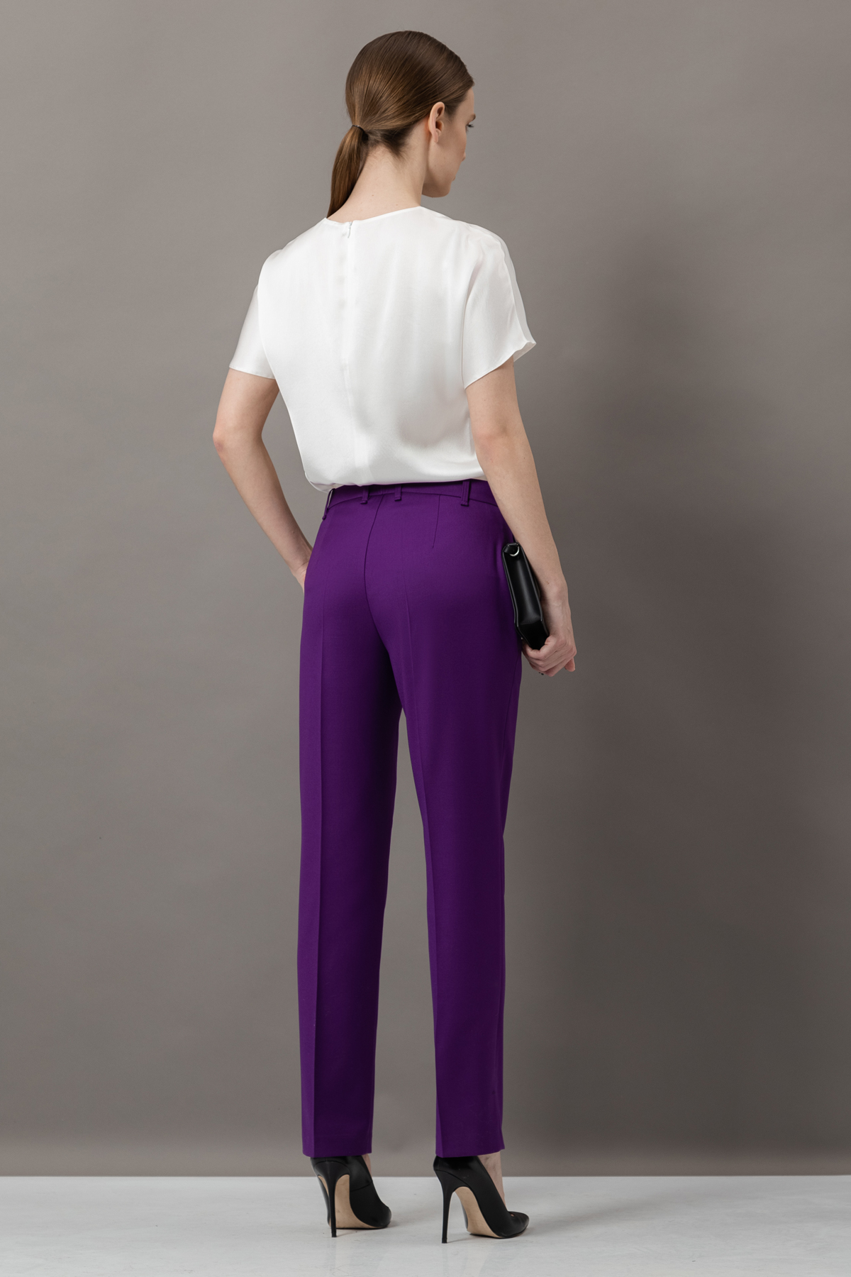 - зауженные брюки со стрелками, боковыми карманами, мягким поясом со шлевками и застежкой на потайную молнию и металлический крючок;