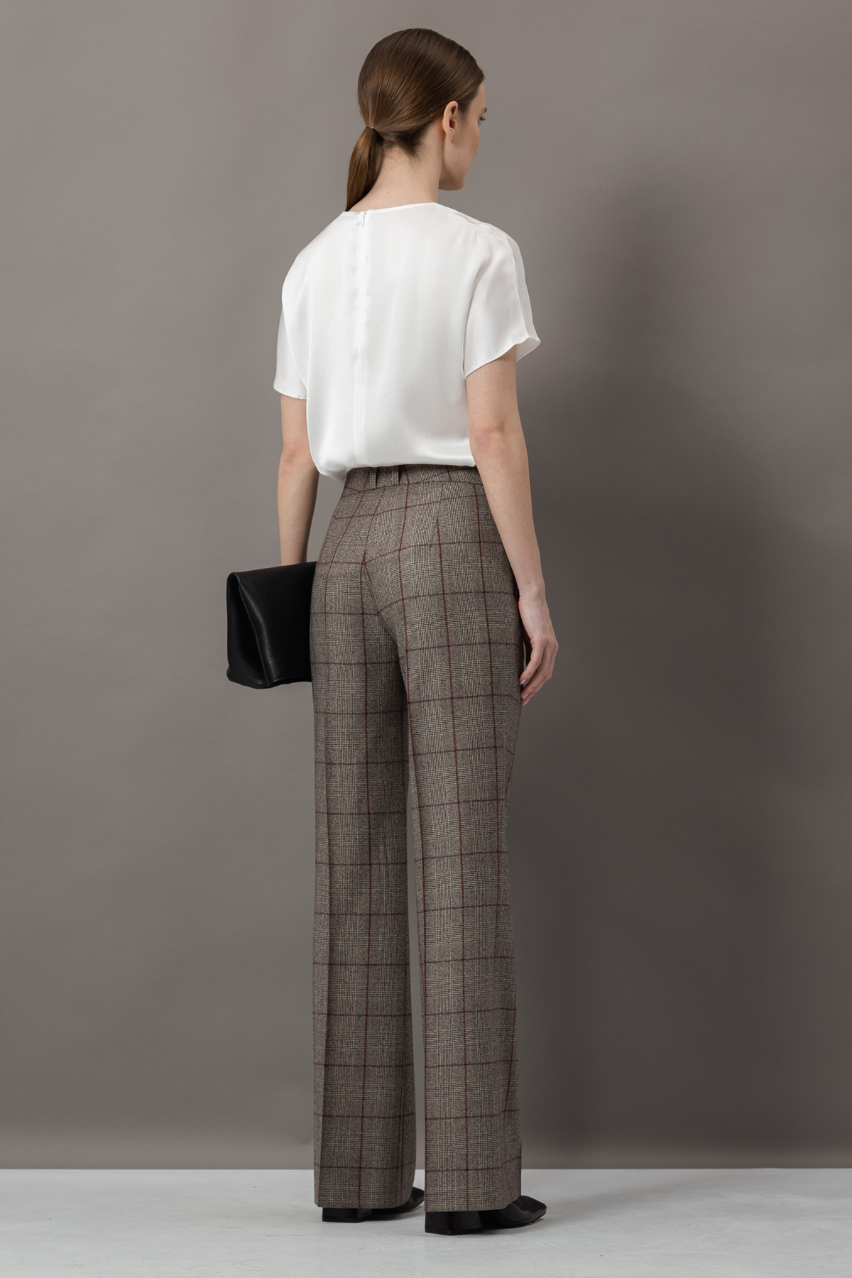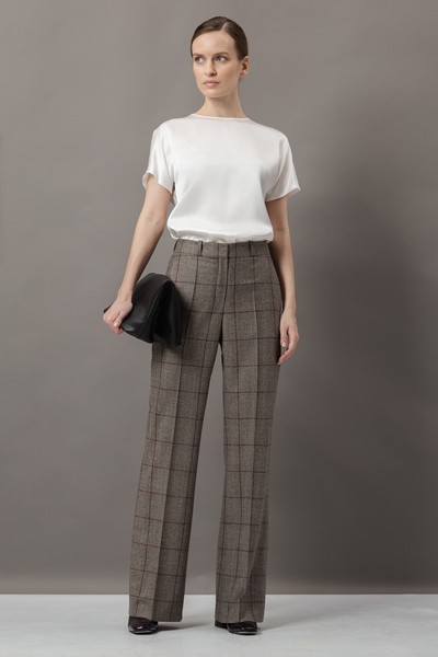 - брюки прямого кроя с боковыми карманами, стрелками, мягким поясом со шлевками и застежкой на потайную молнию и металлический крючок.