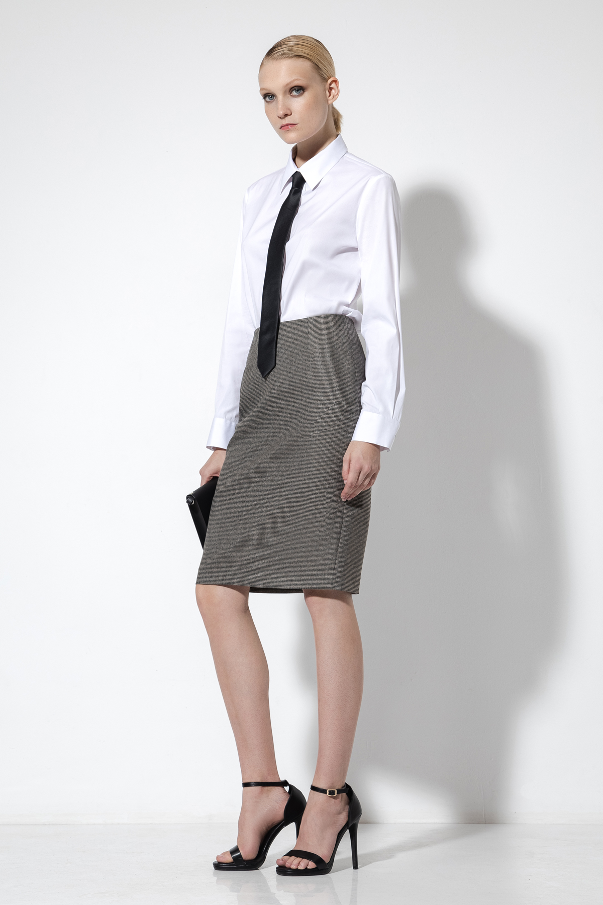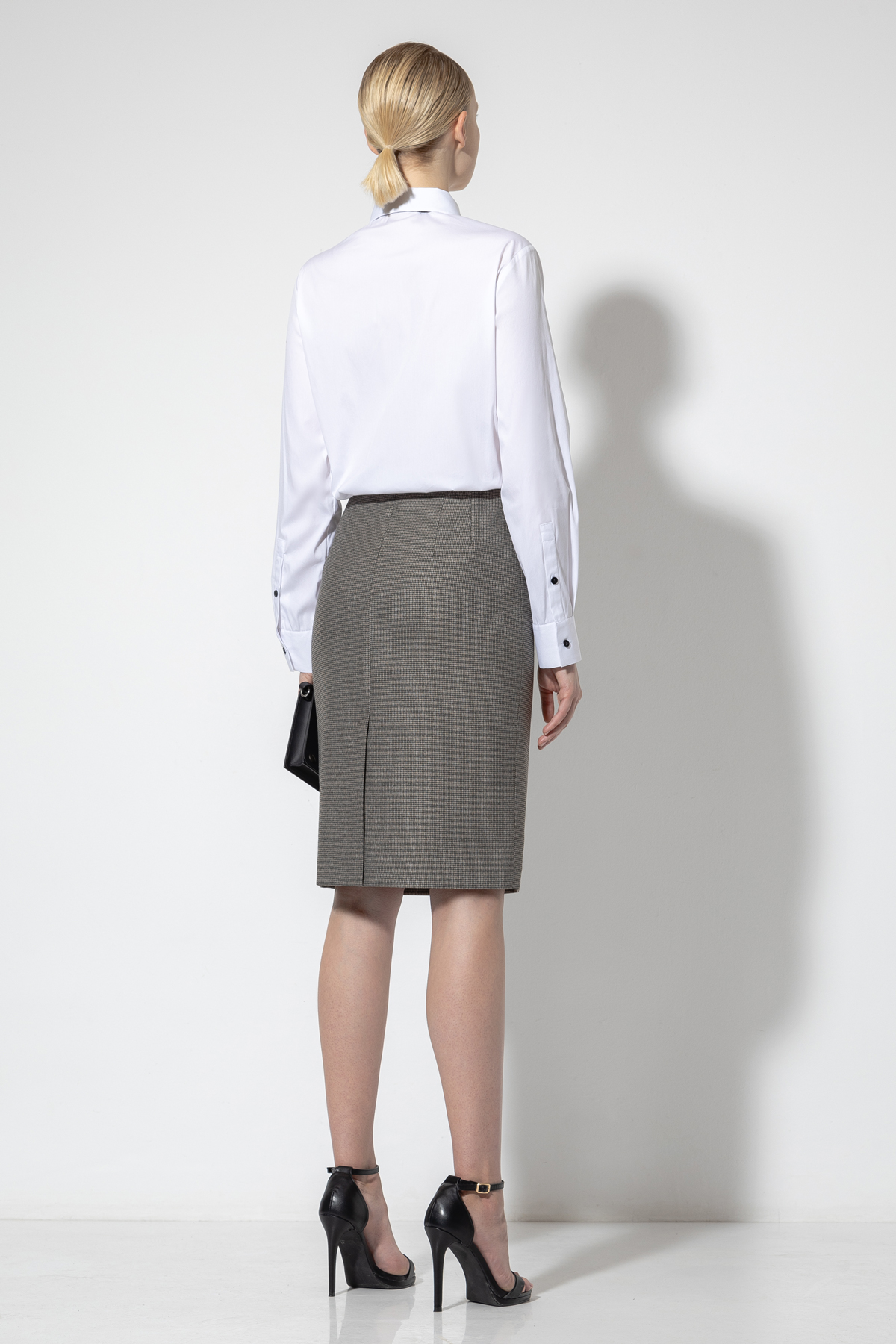 - лаконичную юбку-карандаш в классической длине до колен со шлицей на задней поверхности и застежкой на потайную молнию.