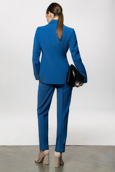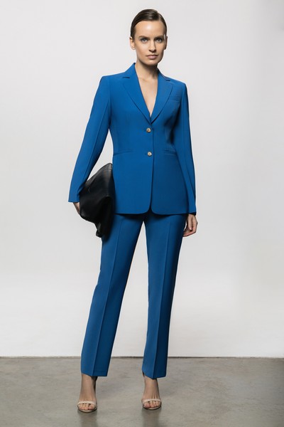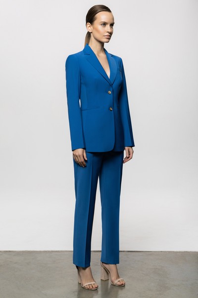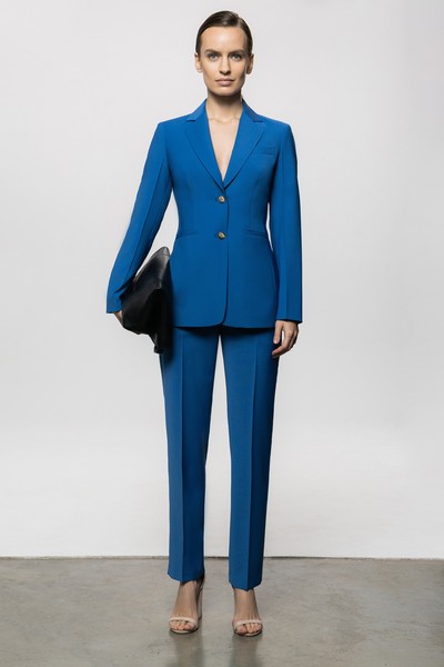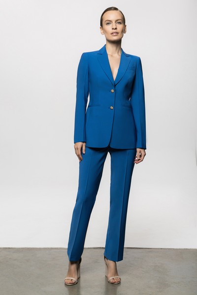 Базовый однобортный жакет с широкими лацканами. Модель приталенного кроя с застежкой на пуговицы. Классические брюки длиной 7/8 дополнены мягким поясом со шлевками и боковыми карманами.