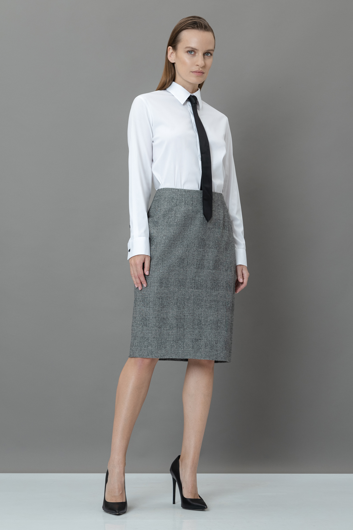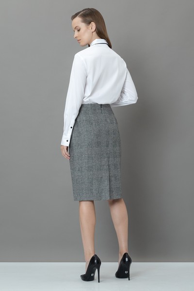 - лаконичную юбку-карандаш в классической длине до колен прямого кроя с застежкой на потайную молнию.