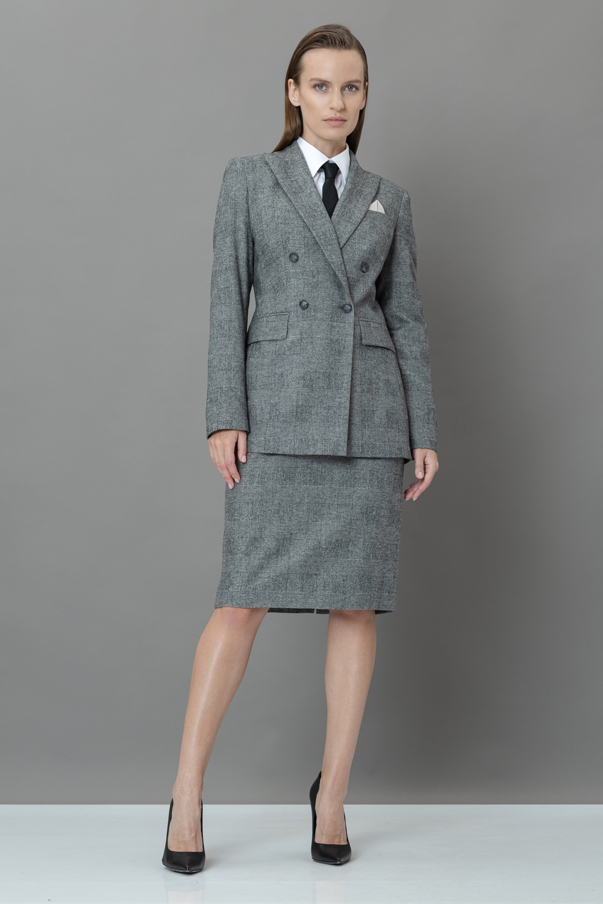 - приталенный двубортный жакет с имитацией кармана на груди и карманами с клапанами.