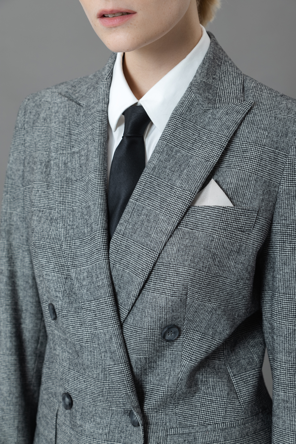 - приталенный двубортный жакет с имитацией кармана на груди и карманами с клапанами;