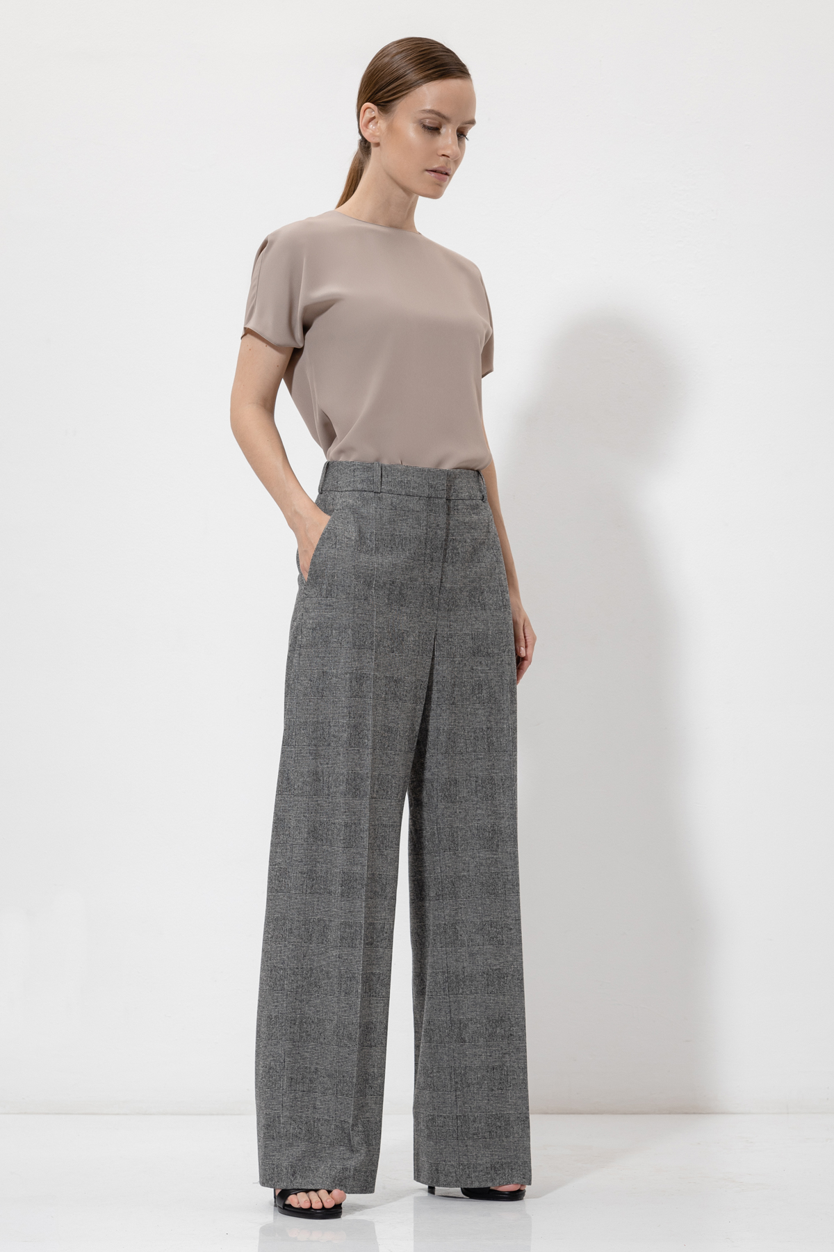 - широкие брюки со стрелками, мягким поясом со шлевками и боковыми карманами.