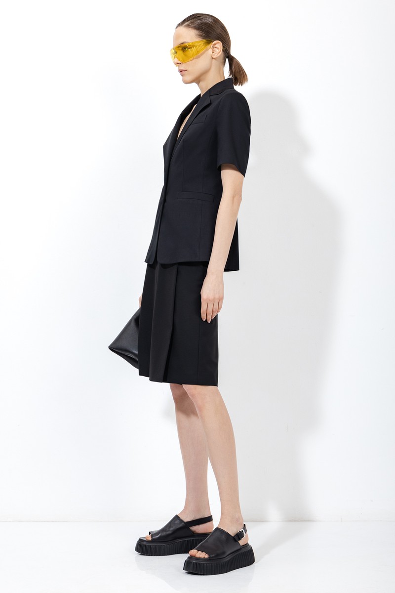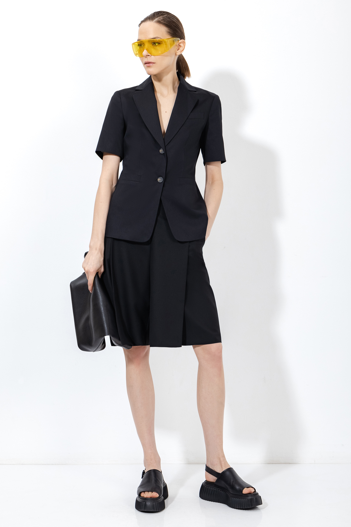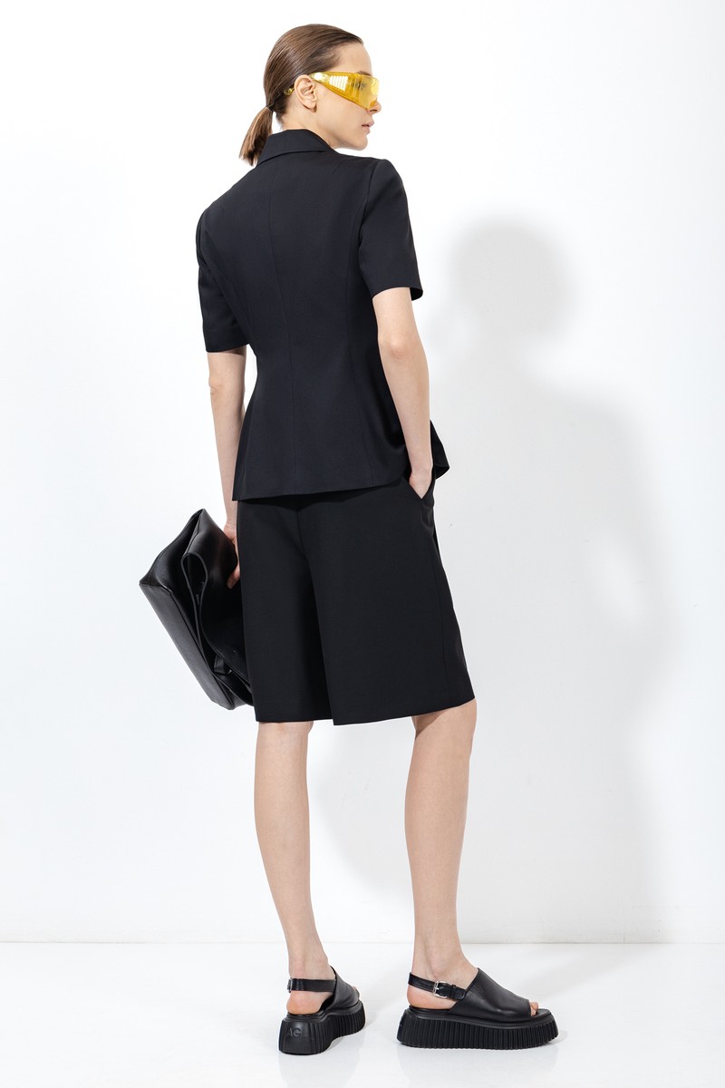 Базовый жакет приталенного кроя с укороченным рукавом. Детали: графичные лацканы с разрезами, имитация карманов и контрастные пуговицы. Акцентные шорты со складками и средней посадкой. Модель свободного кроя дополнена карманами.