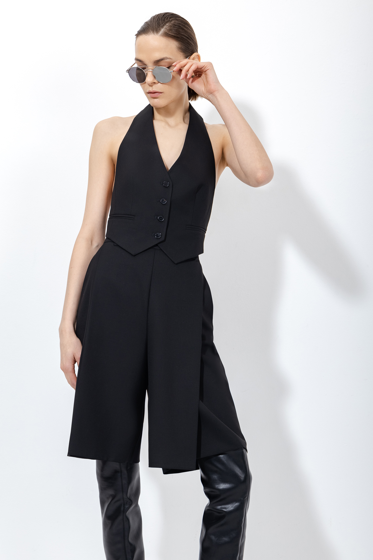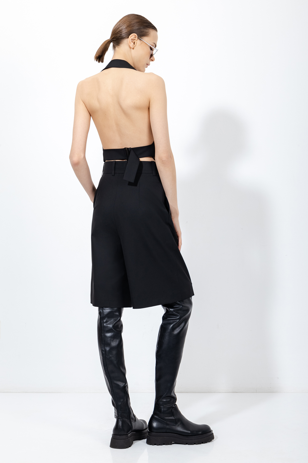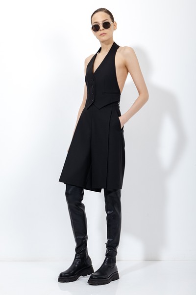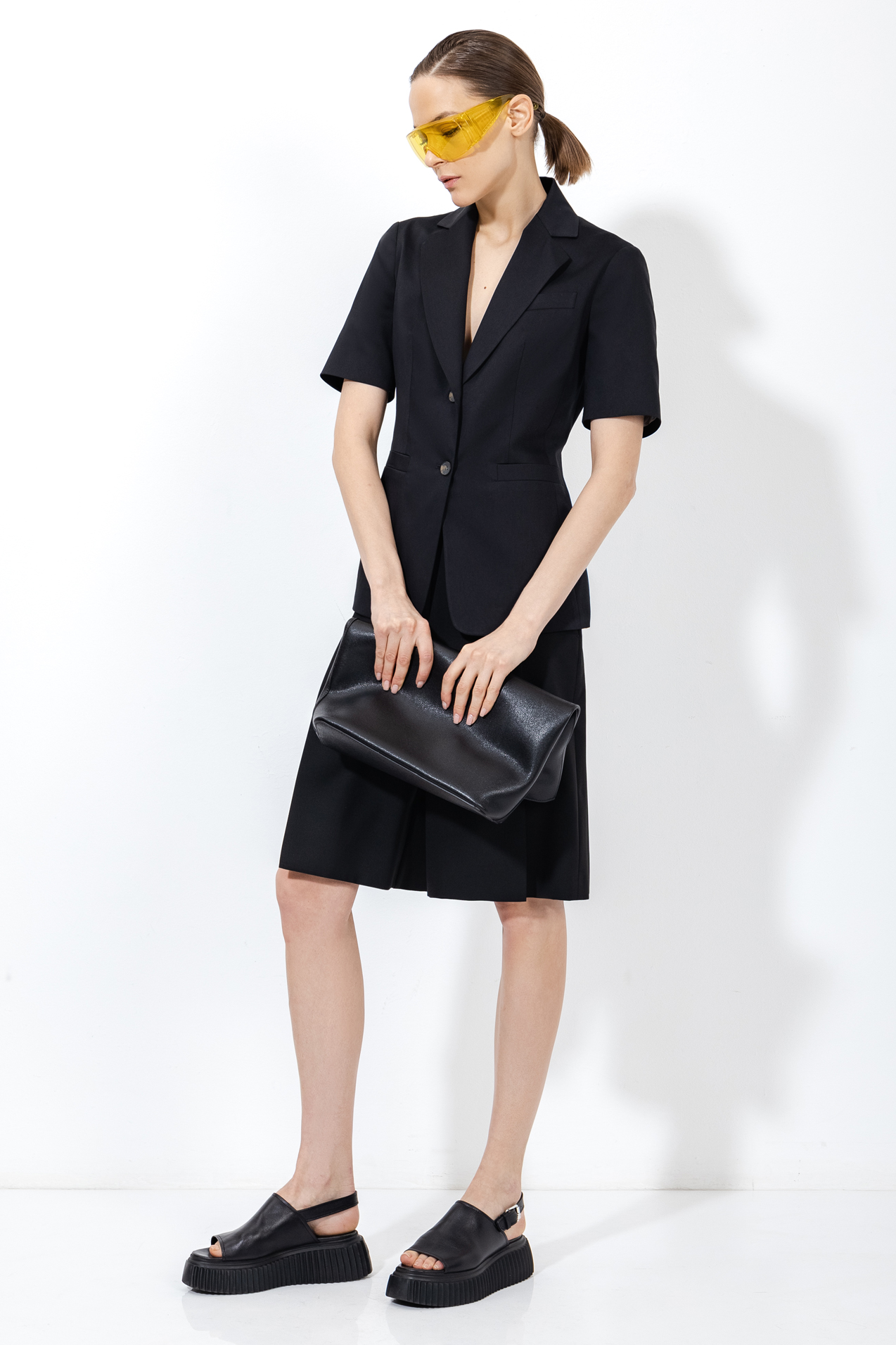 Базовый жакет приталенного кроя с укороченным рукавом. Детали: графичные лацканы с разрезами, имитация карманов и контрастные пуговицы. Акцентные шорты со складками и средней посадкой. Модель свободного кроя дополнена карманами.
