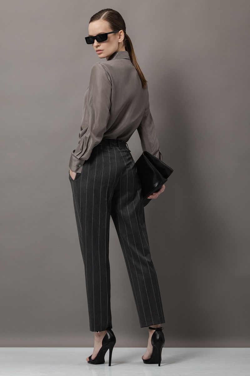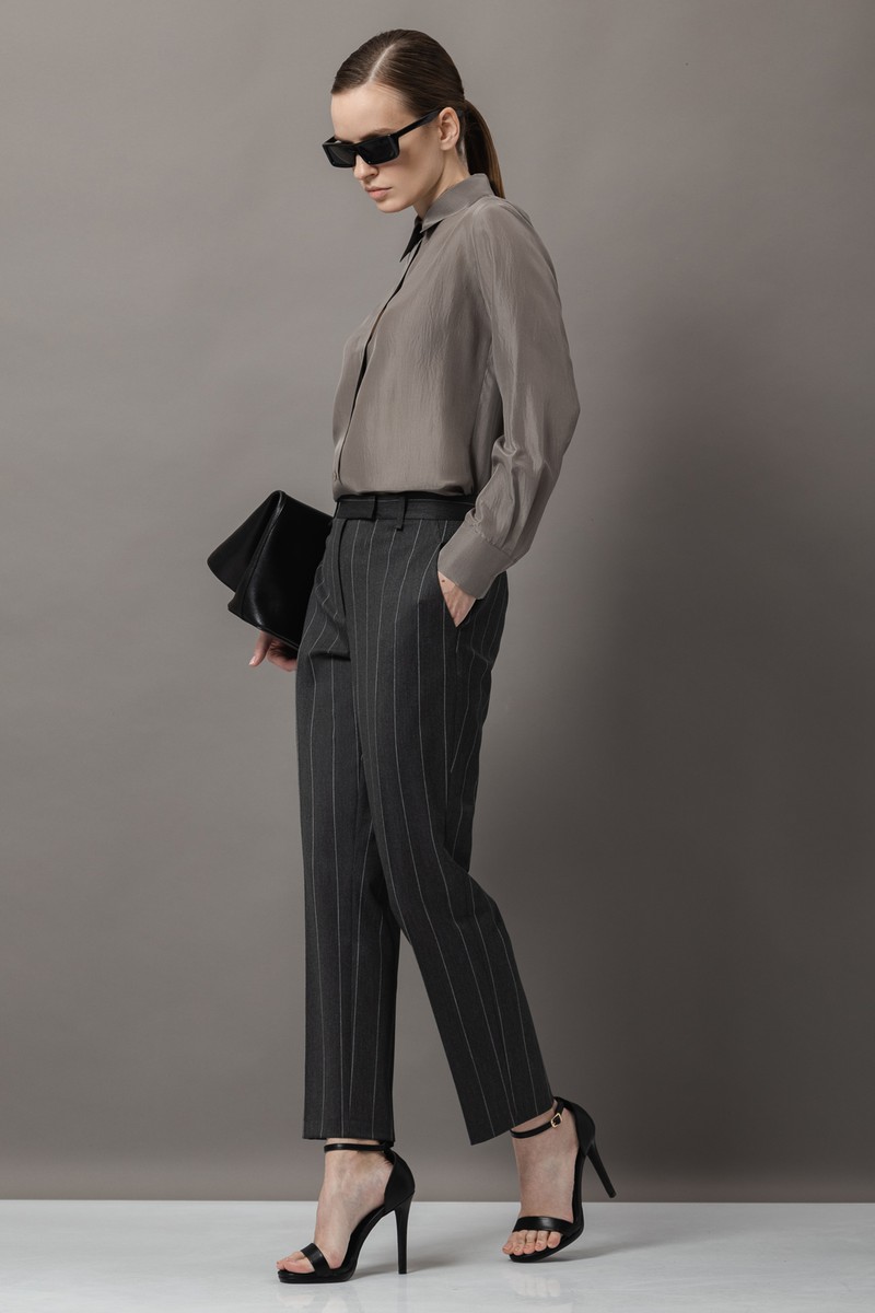 - зауженные брюки со стрелками, боковыми карманами, мягким поясом со шлевками и застежкой на потайную молнию и металлический крючок.