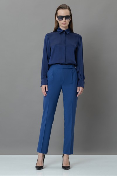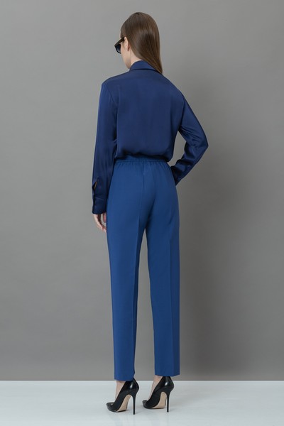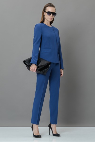 - зауженные брюки со стрелками, боковыми карманами, мягким поясом со шлевками и застежкой на потайную молнию и металлический крючок.