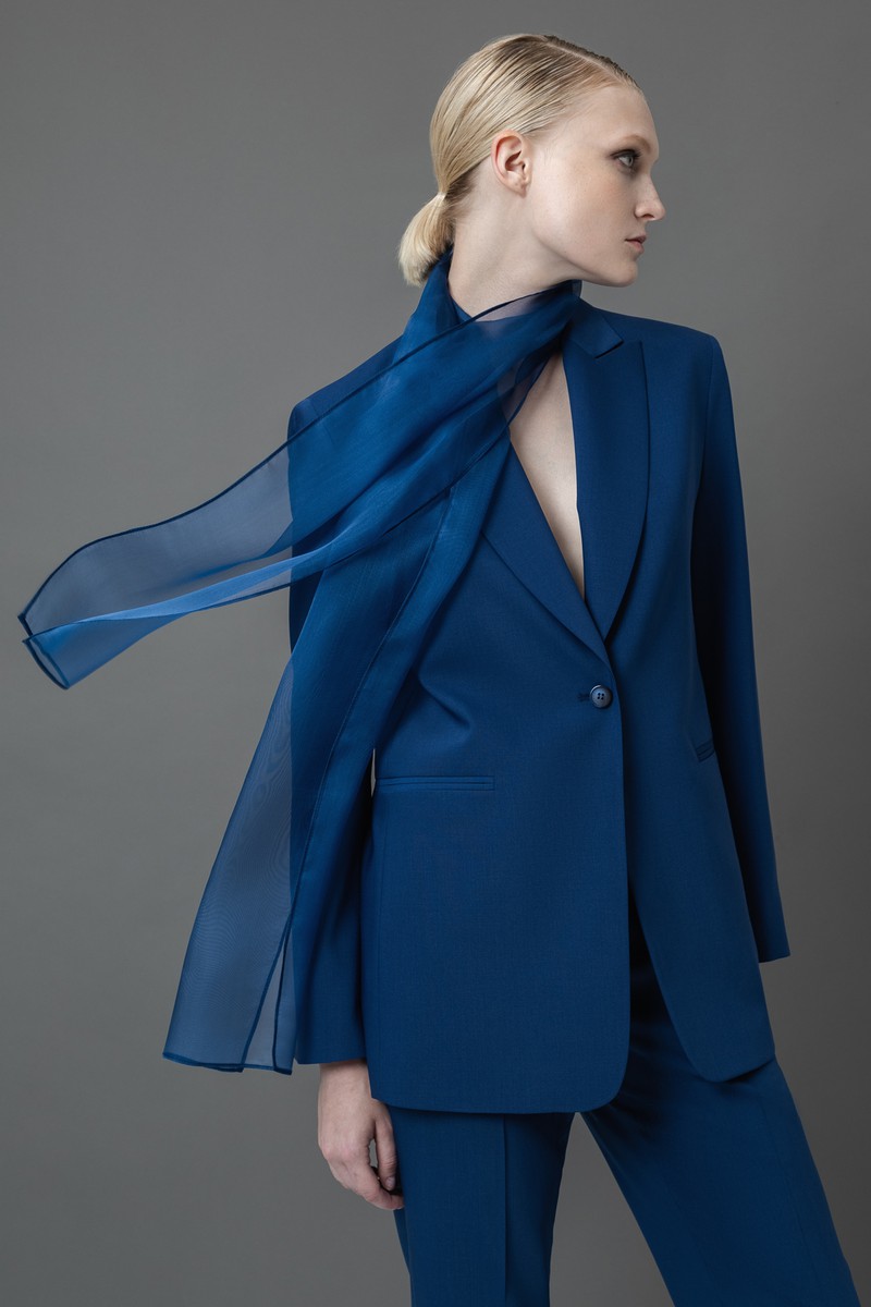 - однобортный жакет прямого кроя с шарфом в тон основной ткани из легкого шелка;