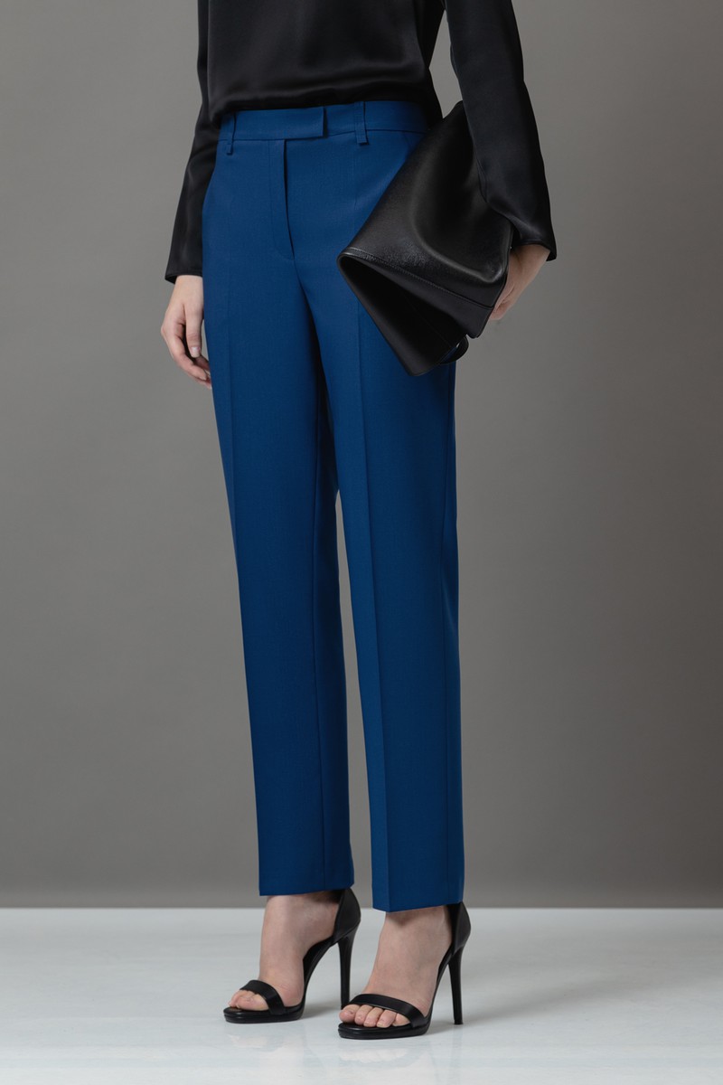 - прямые брюки со стрелками, боковыми карманами и застежкой на потайную молнию и металлический крючок;
