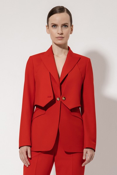 - застежкой на пуговицу контрастного цвета, графичными лацканами, карманами и съемной деталью.