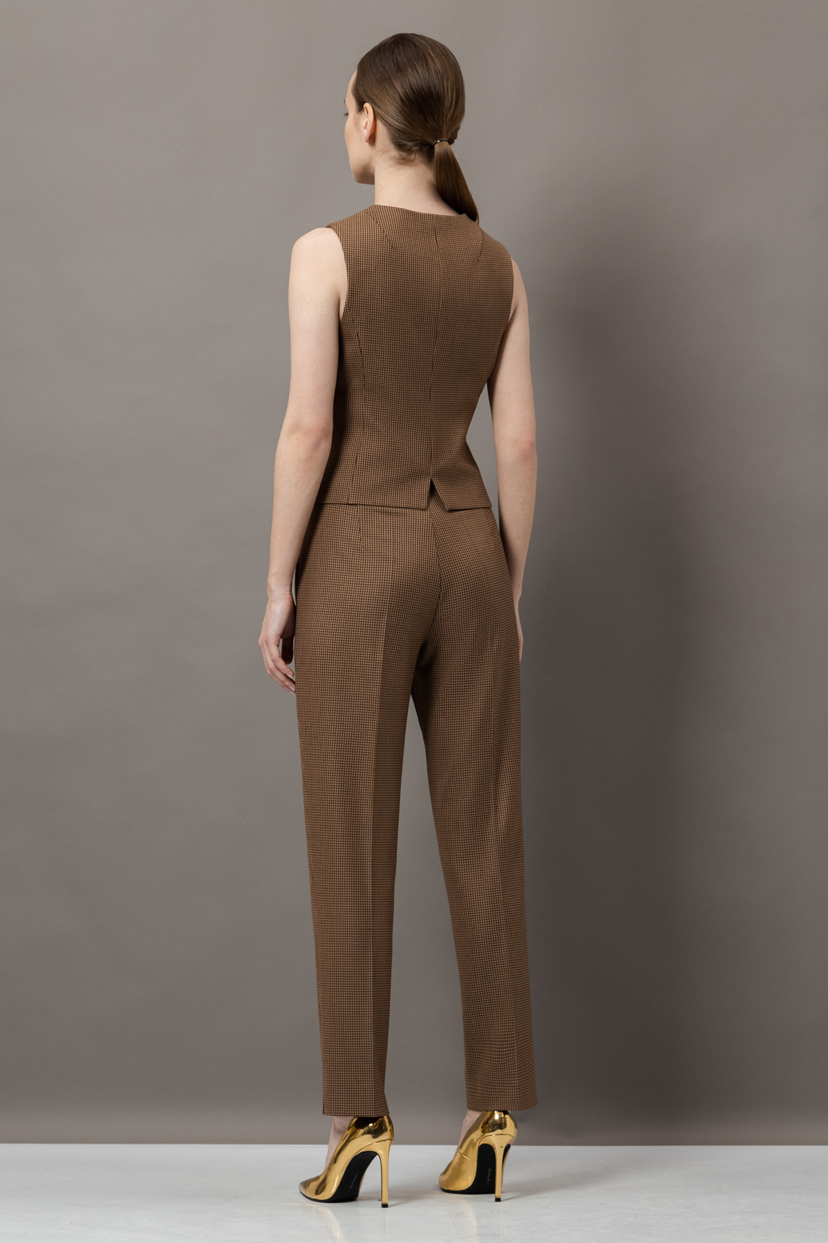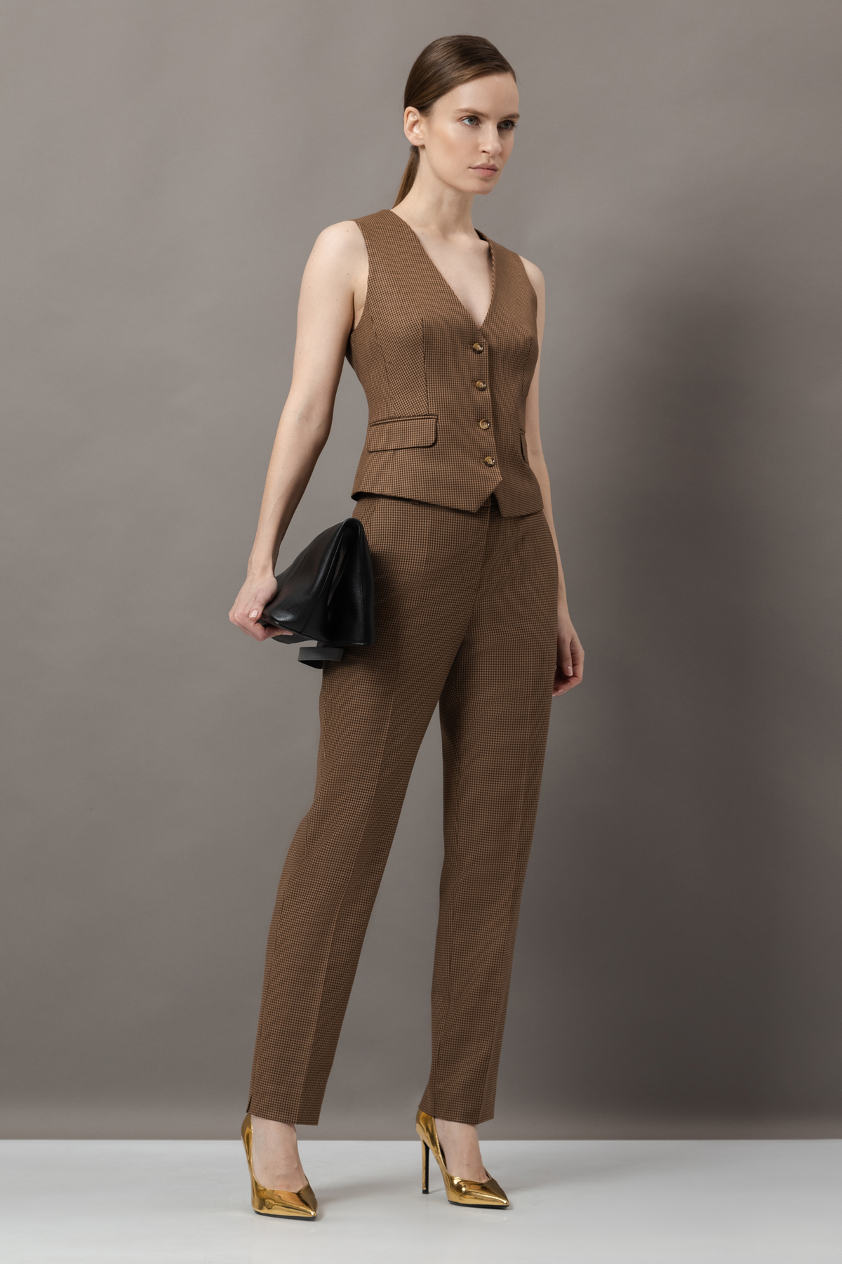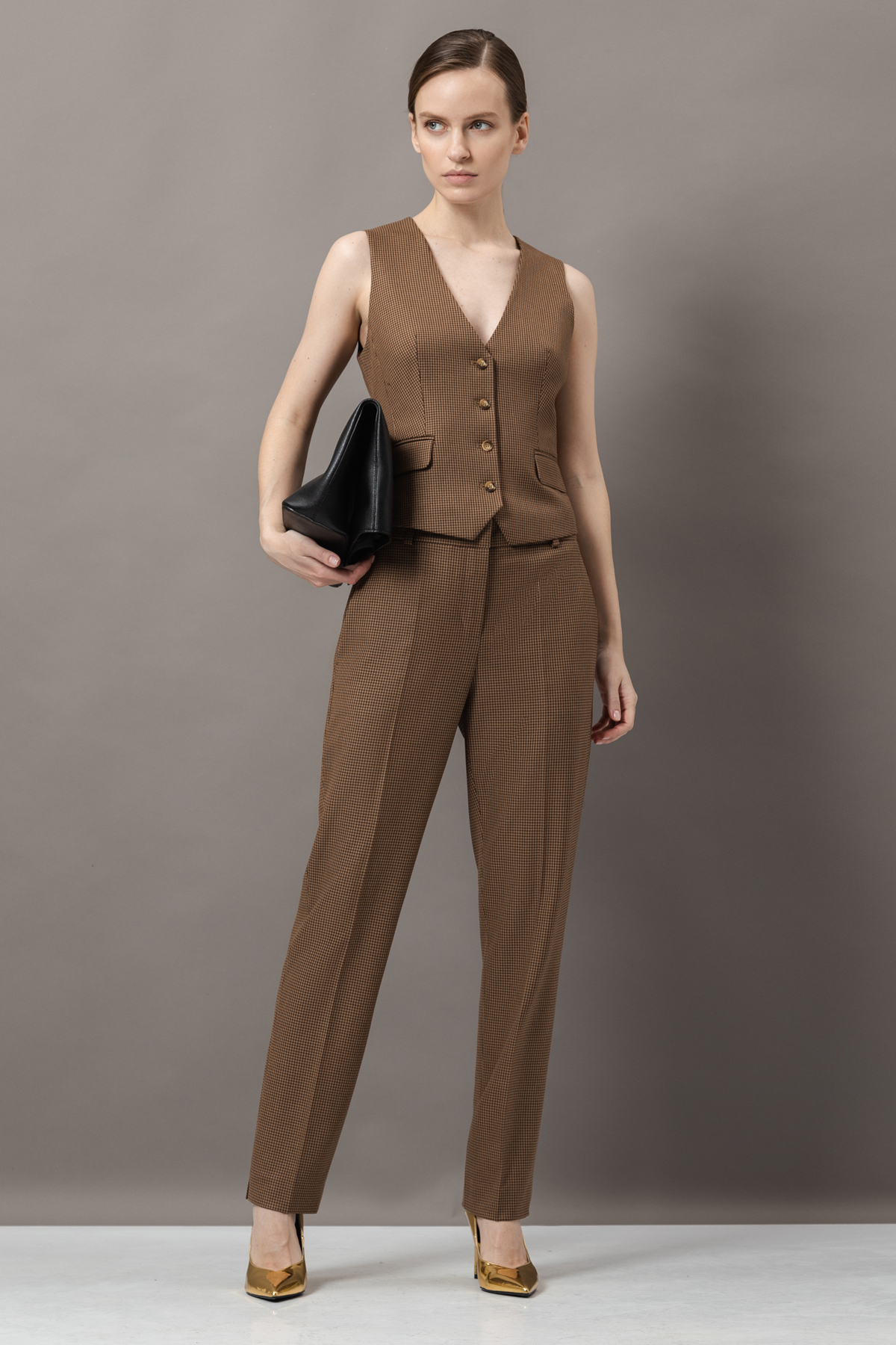 - лаконичный жилет приталенного кроя с пуговицами в тон и имитацией карманов;