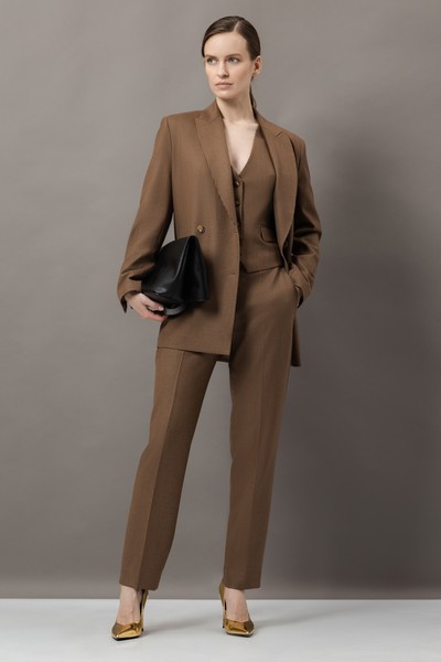 - зауженные брюки со стрелками, боковыми карманами, мягким поясом со шлевками и застежкой на потайную молнию и металлический крючок;
