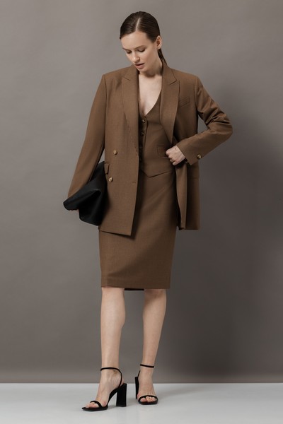 - прямую юбку в классической длине до колен со шлицей и застежка на потайную молнию на задней поверхности.