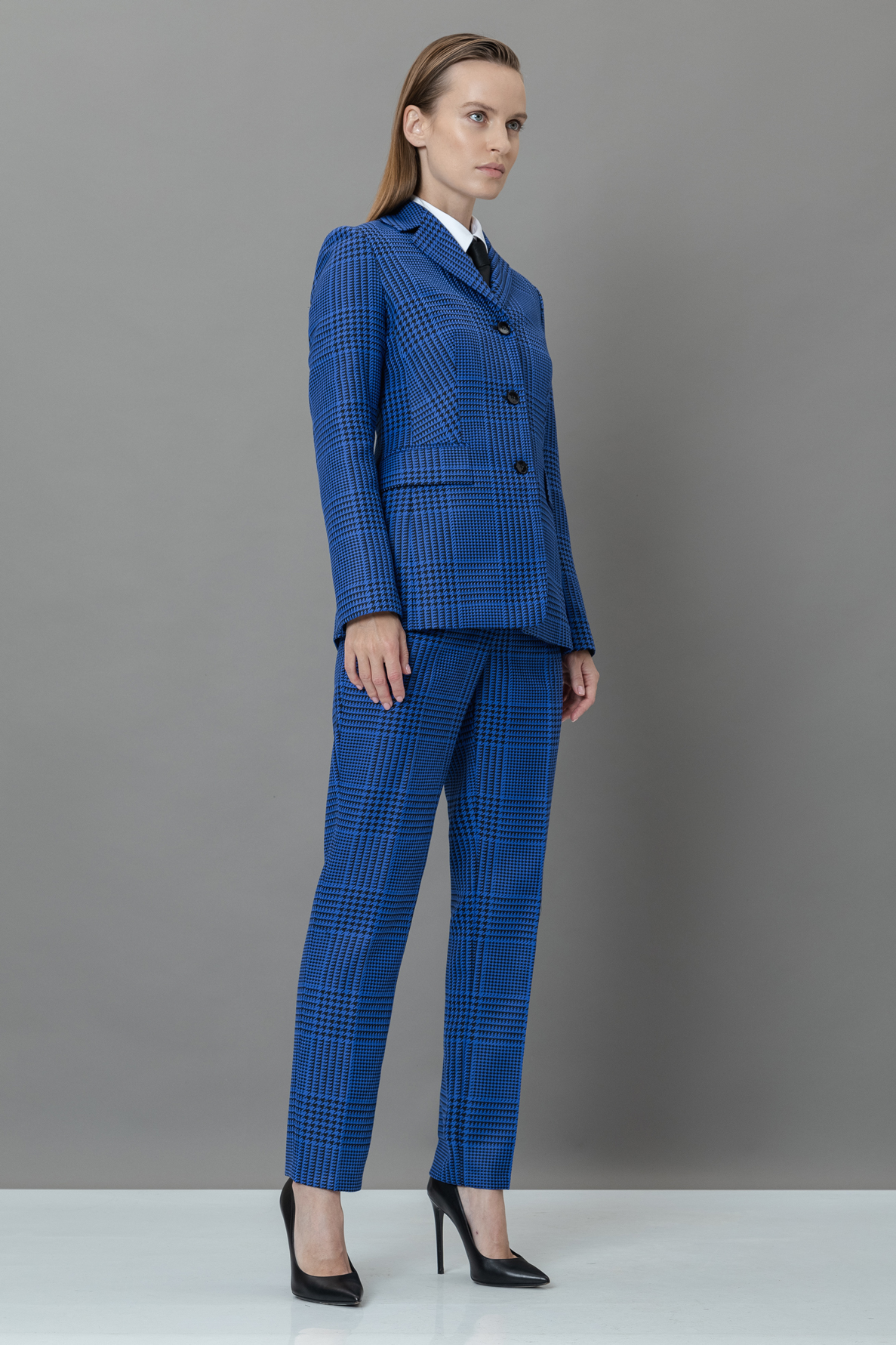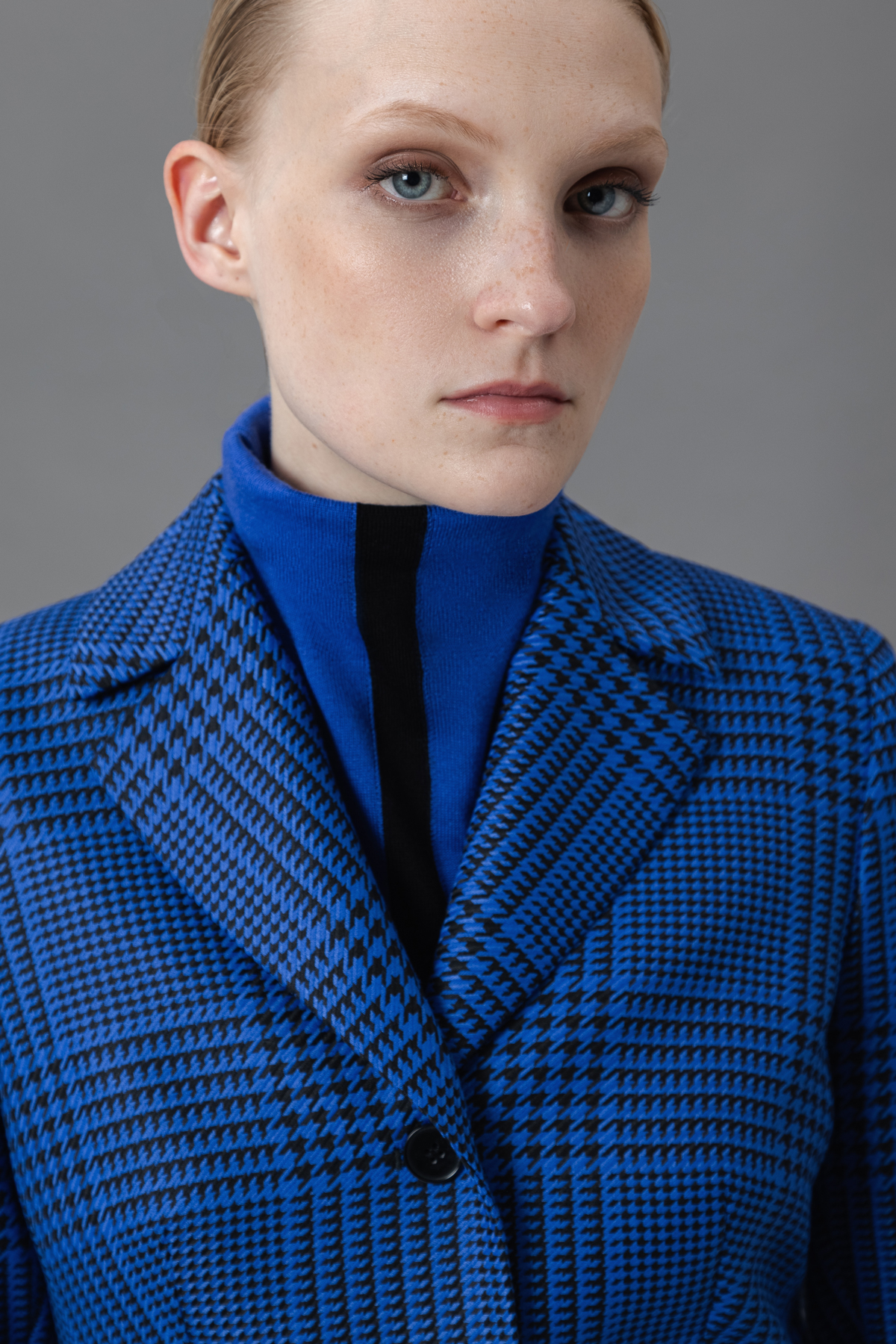 - однобортный удлиненный жакет с карманами с клапанами, контрастными пуговицами;