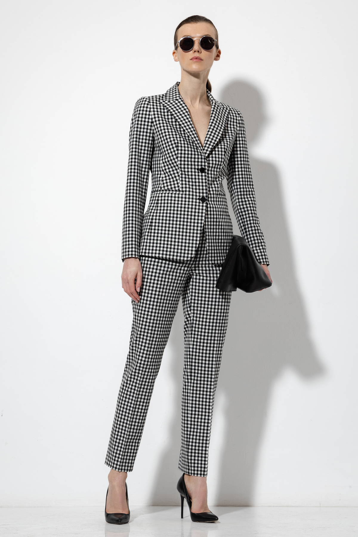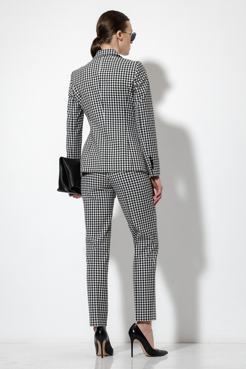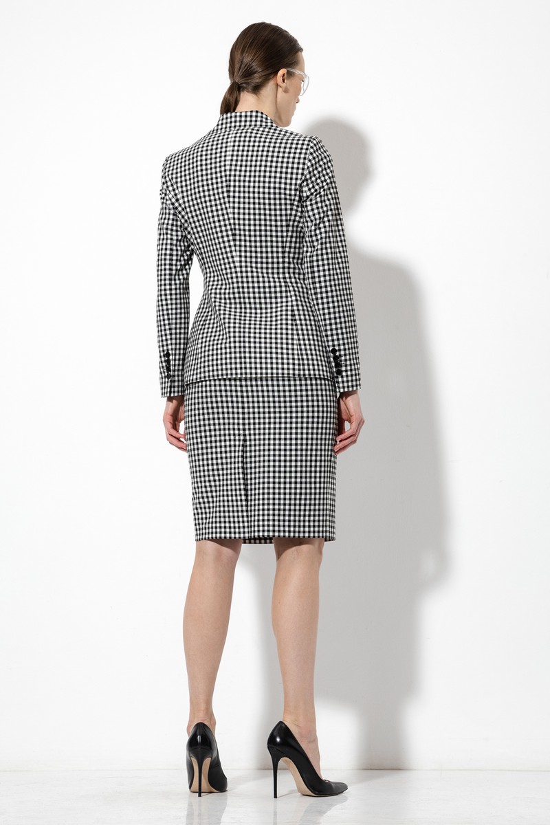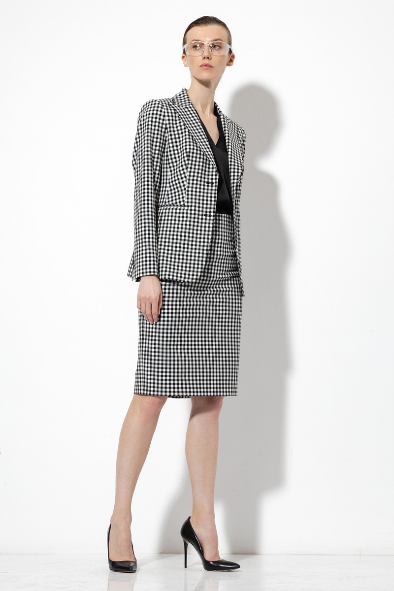 Базовый однобортный жакет приталенного кроя. Удлиненная модель дополнена графичными лацканами, контрастной пуговицей и имитацией карманов. Классические брюки зауженного кроя выполнены в длине 7/8 и дополнены стрелками и карманами. Мягкий пояс со шлевками позволяет носить брюки с ремнем. Лаконичная юбка-карандаш со шлицей выполнена в классической длине до колен.