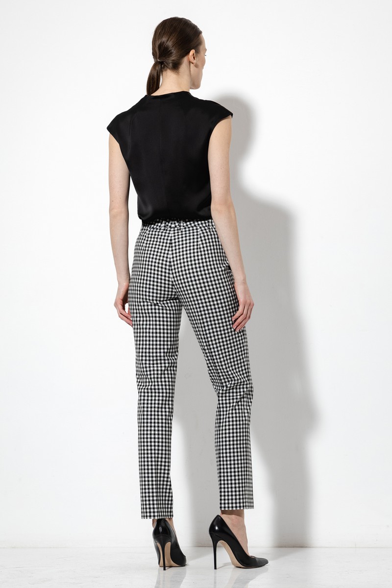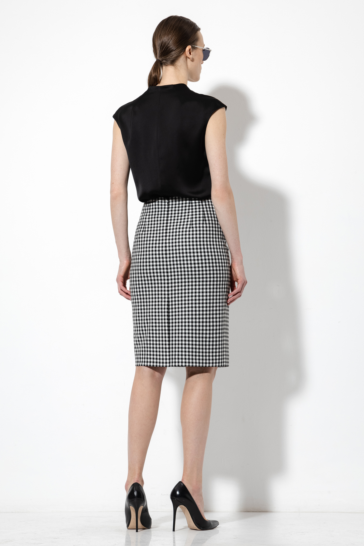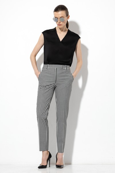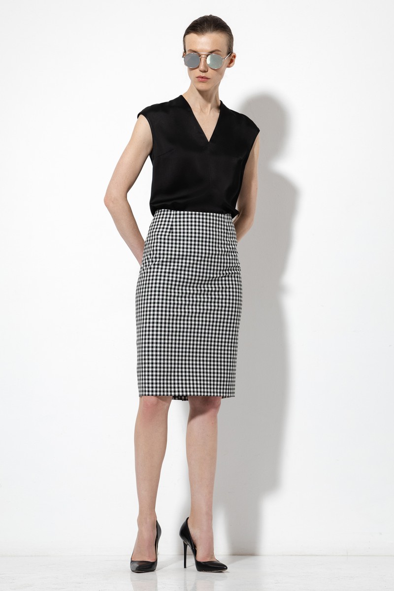 Базовый однобортный жакет приталенного кроя. Удлиненная модель дополнена графичными лацканами, контрастной пуговицей и имитацией карманов. Классические брюки зауженного кроя выполнены в длине 7/8 и дополнены стрелками и карманами. Мягкий пояс со шлевками позволяет носить брюки с ремнем. Лаконичная юбка-карандаш со шлицей выполнена в классической длине до колен.