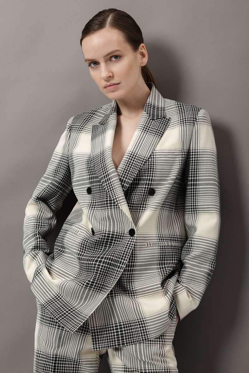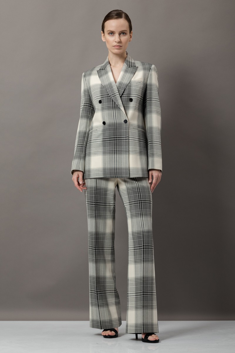 - двубортный жакет прямого кроя с графичными лацканами и прорезными карманами;