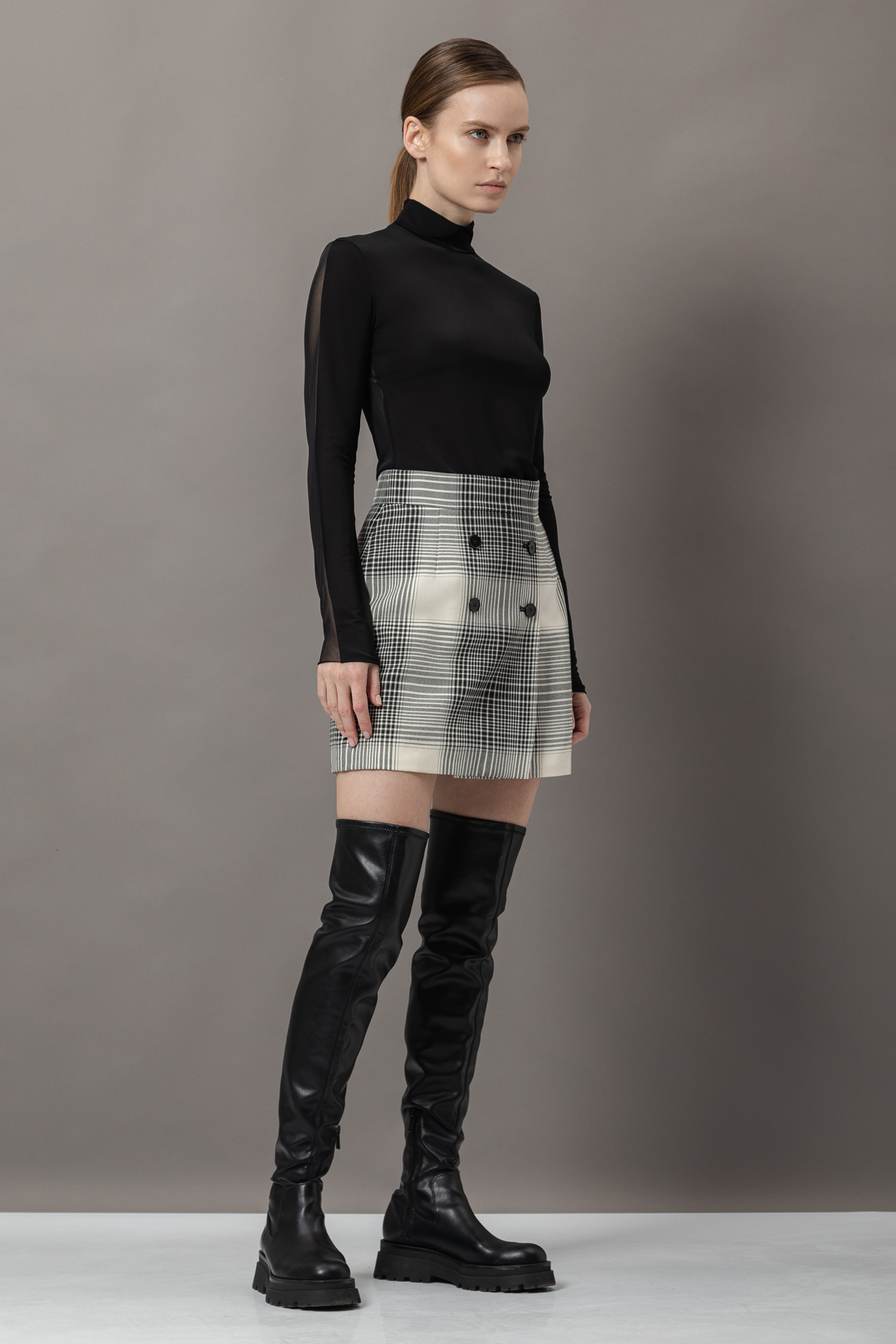 - мини-юбку прямого кроя с имитацией запаха и застежкой на потайную молнию.