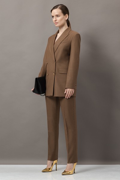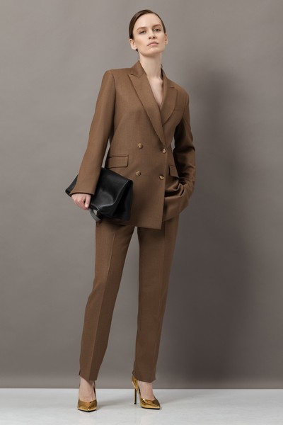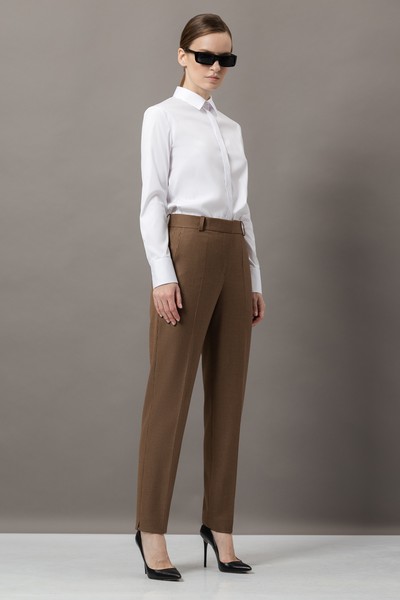 - зауженные брюки со стрелками, боковыми карманами, мягким поясом со шлевками и застежкой на потайную молнию и металлический крючок;