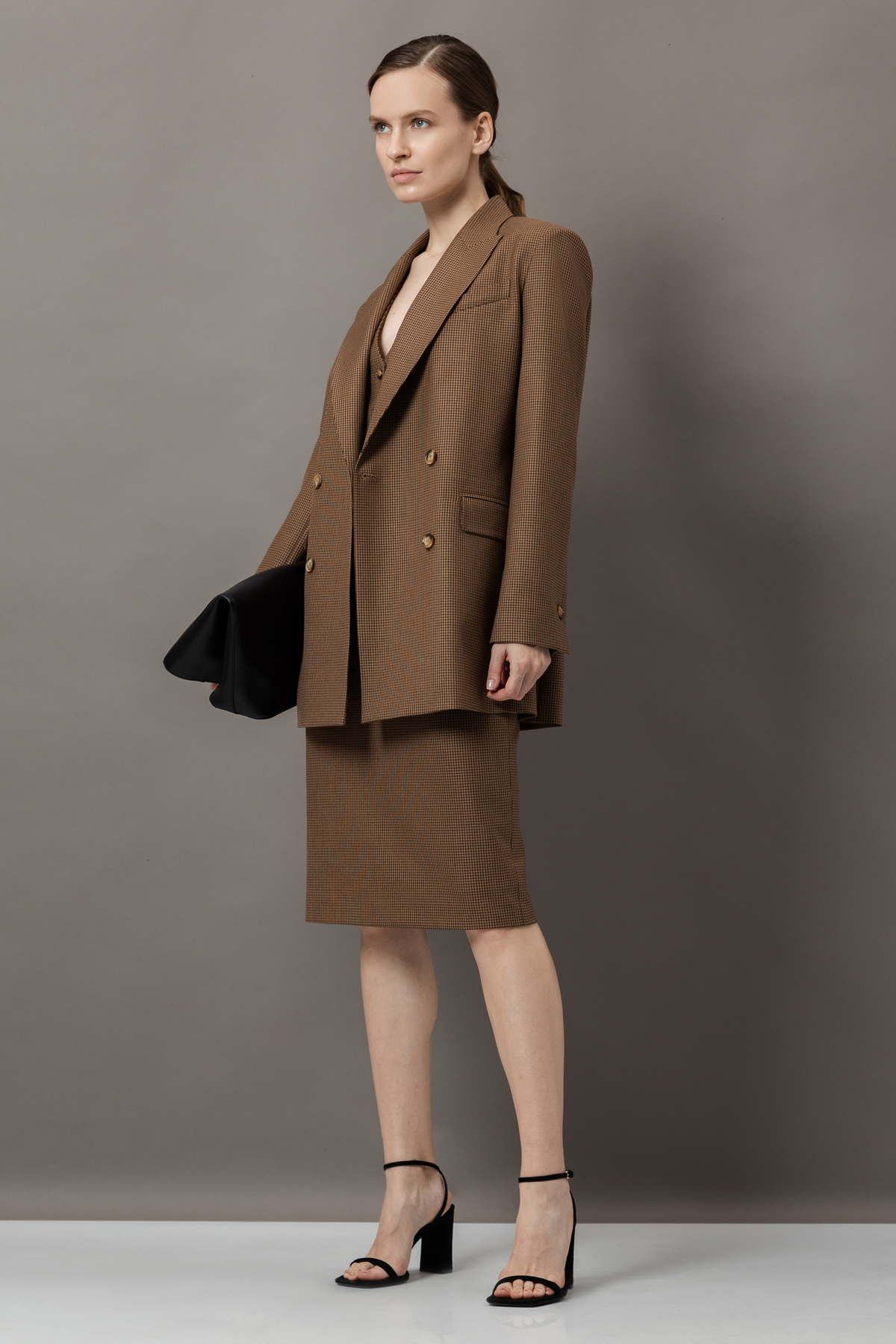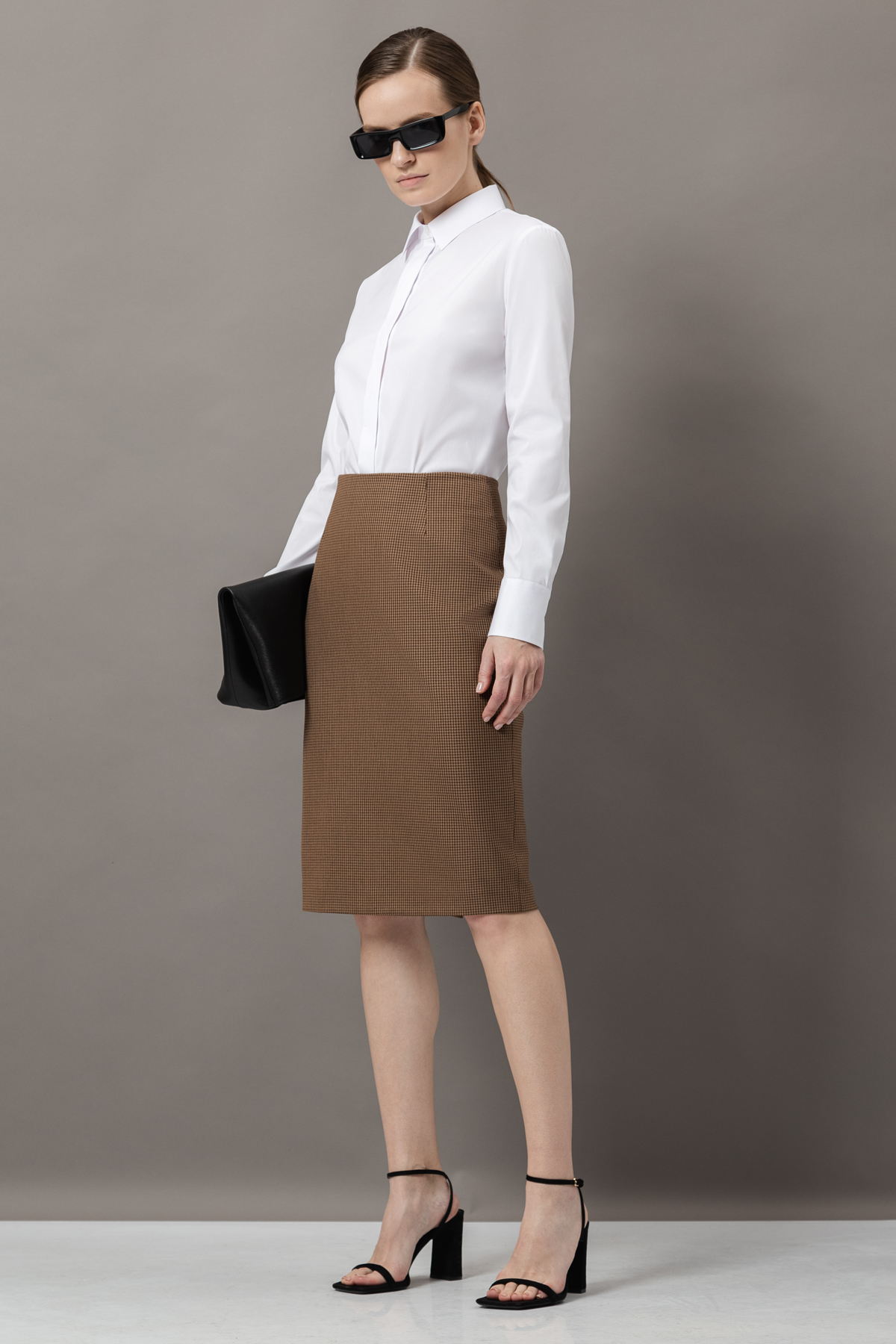 - прямую юбку в классической длине до колен со шлицей и застежка на потайную молнию на задней поверхности.