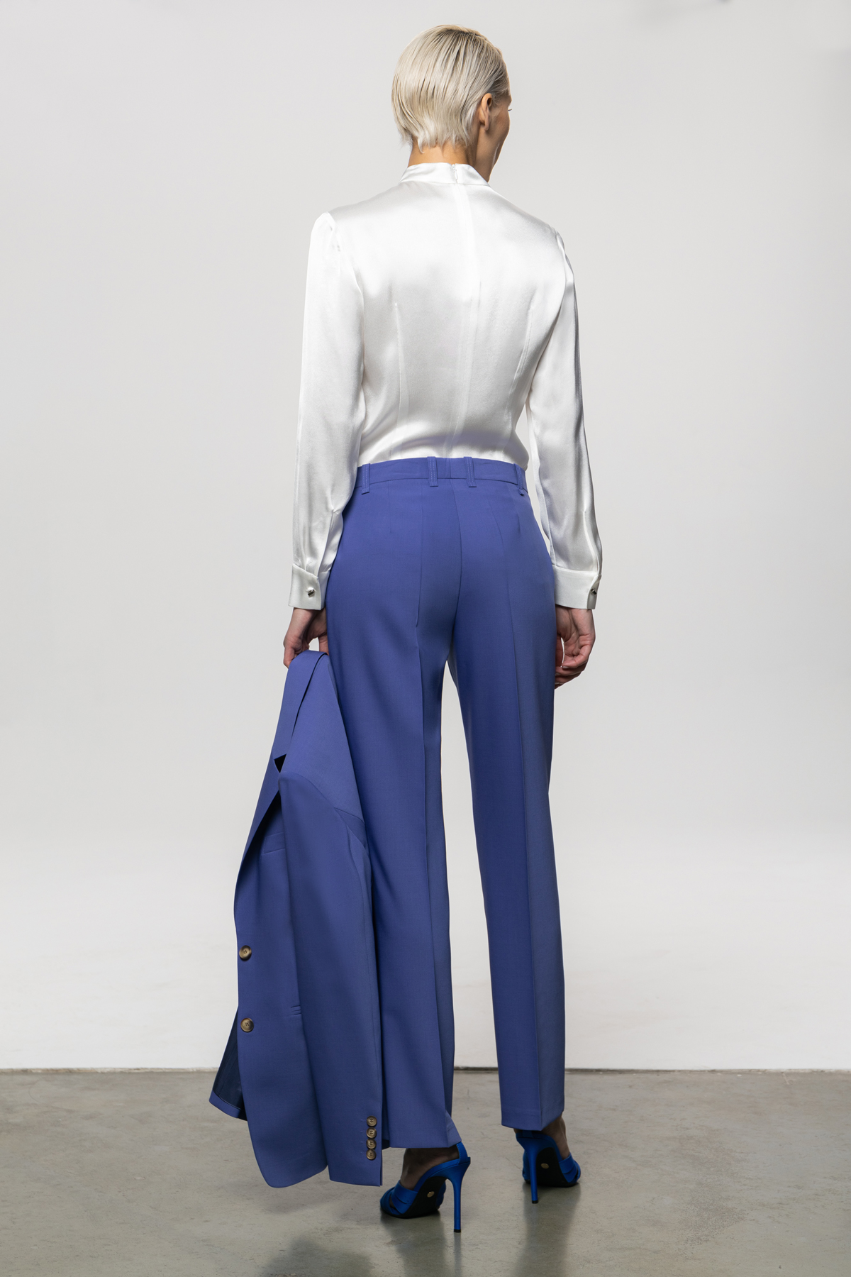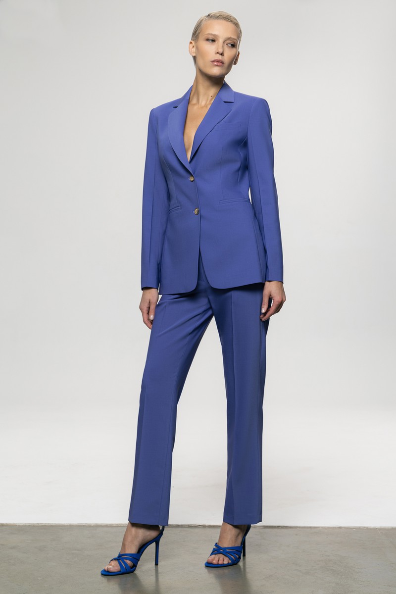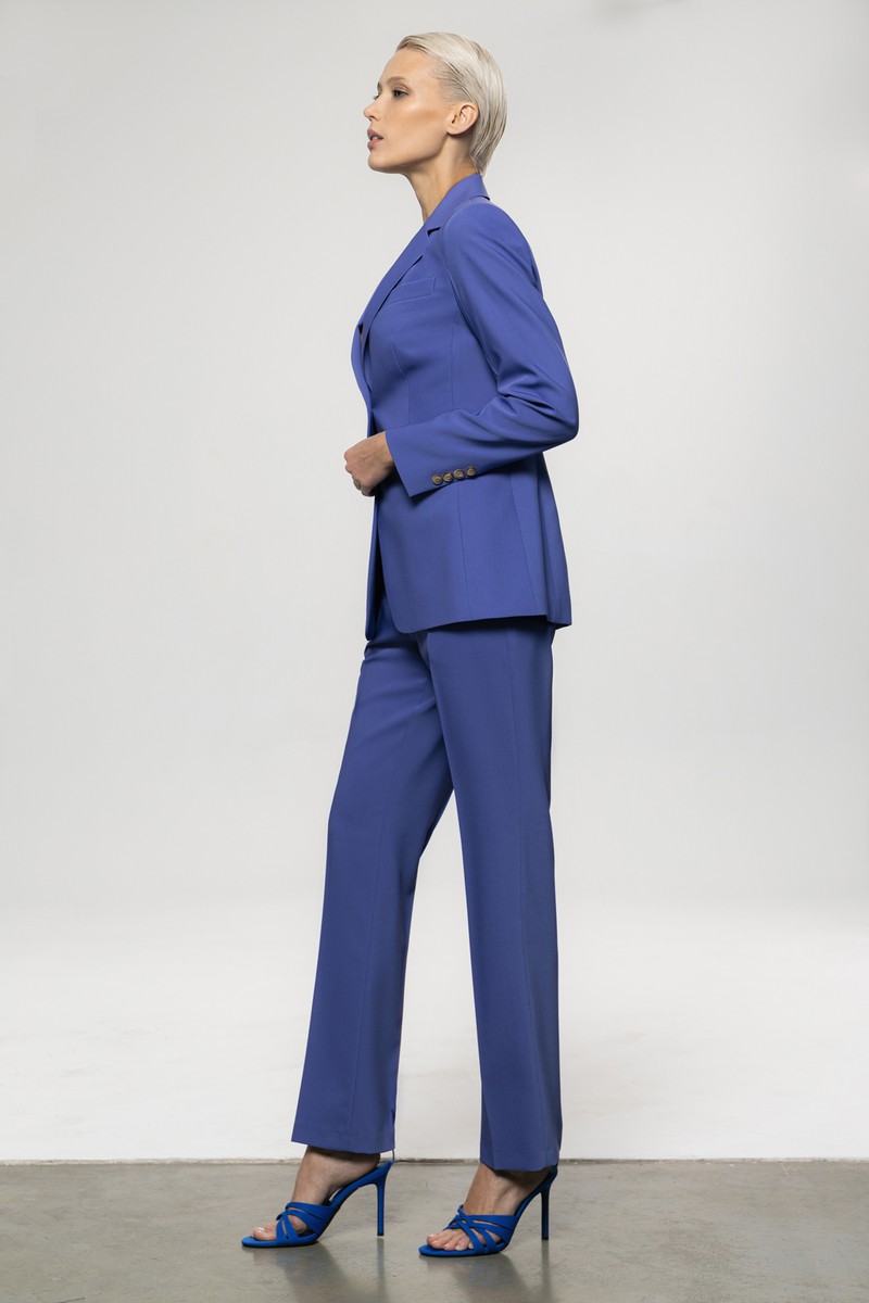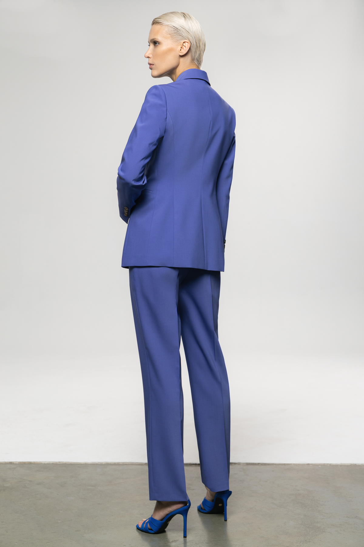 Классический костюм из смесовой ткани с добавлением шерсти. Материал хорошо держит форму и сохраняет тепло. Зауженные брюки длиной 7/8 дополнены поясом со шлевками и боковыми карманами. Посадка — средняя. Костюм также включает однобортный жакет приталенного кроя.