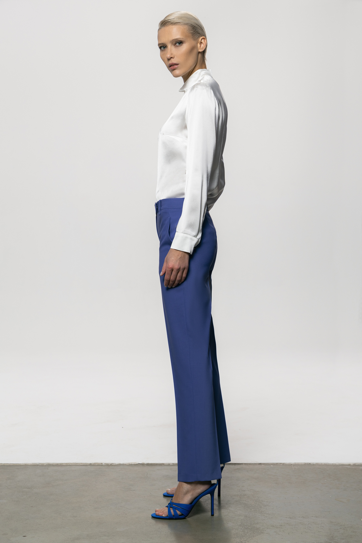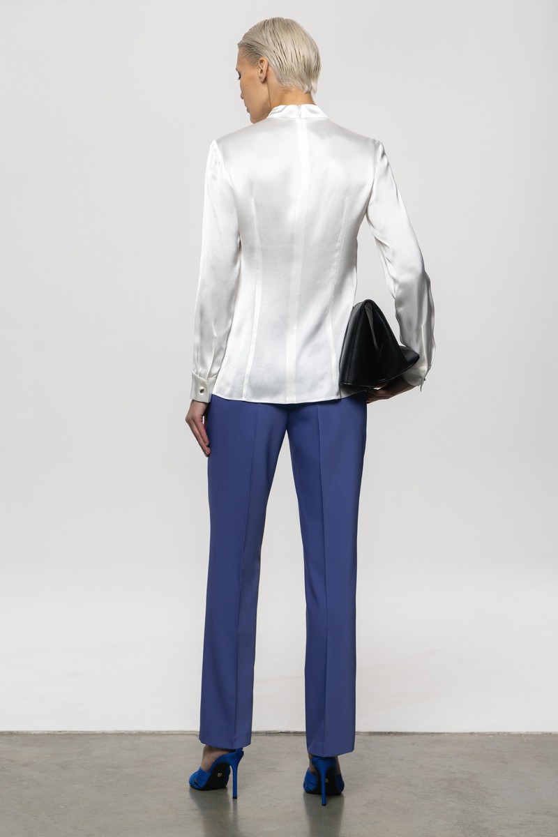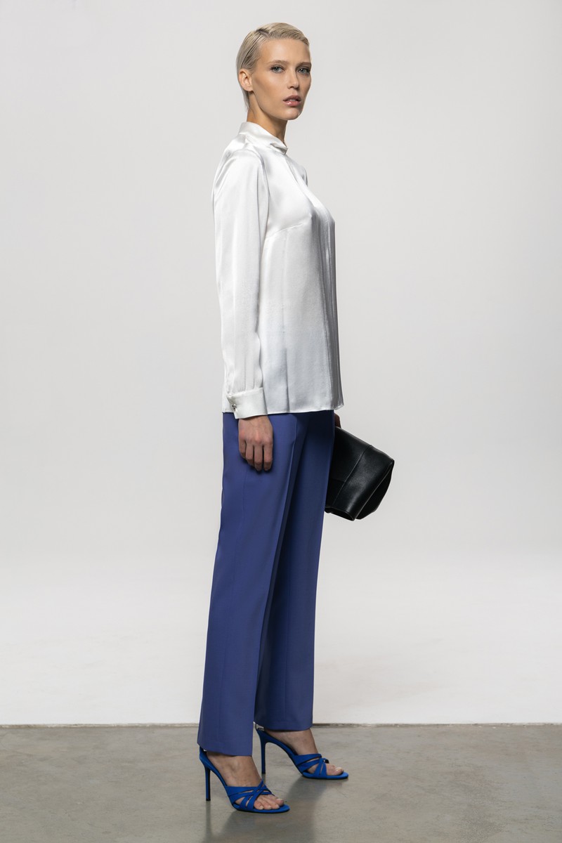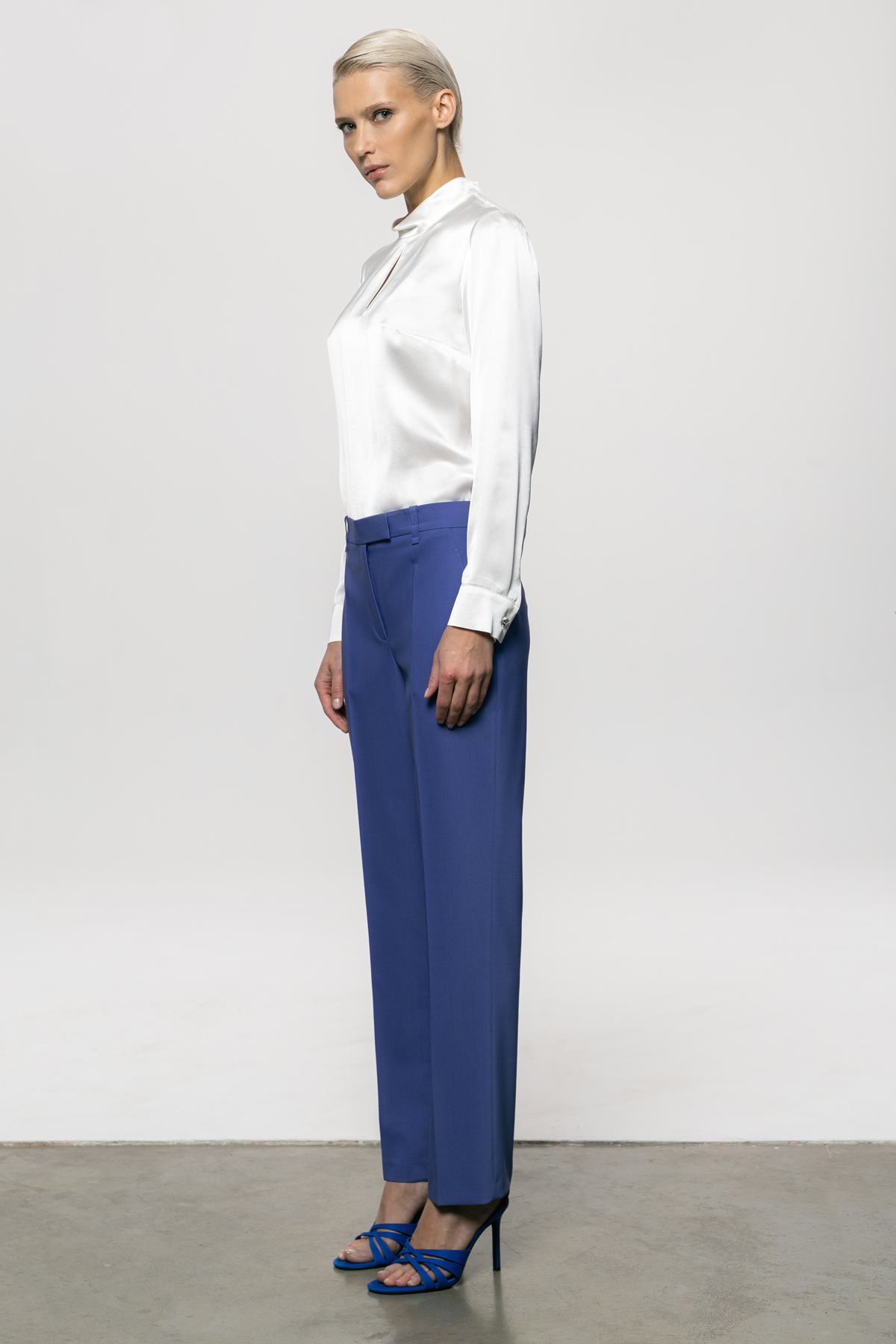 Классический костюм из смесовой ткани с добавлением шерсти. Материал хорошо держит форму и сохраняет тепло. Зауженные брюки длиной 7/8 дополнены поясом со шлевками и боковыми карманами. Посадка — средняя. Костюм также включает однобортный жакет приталенного кроя.